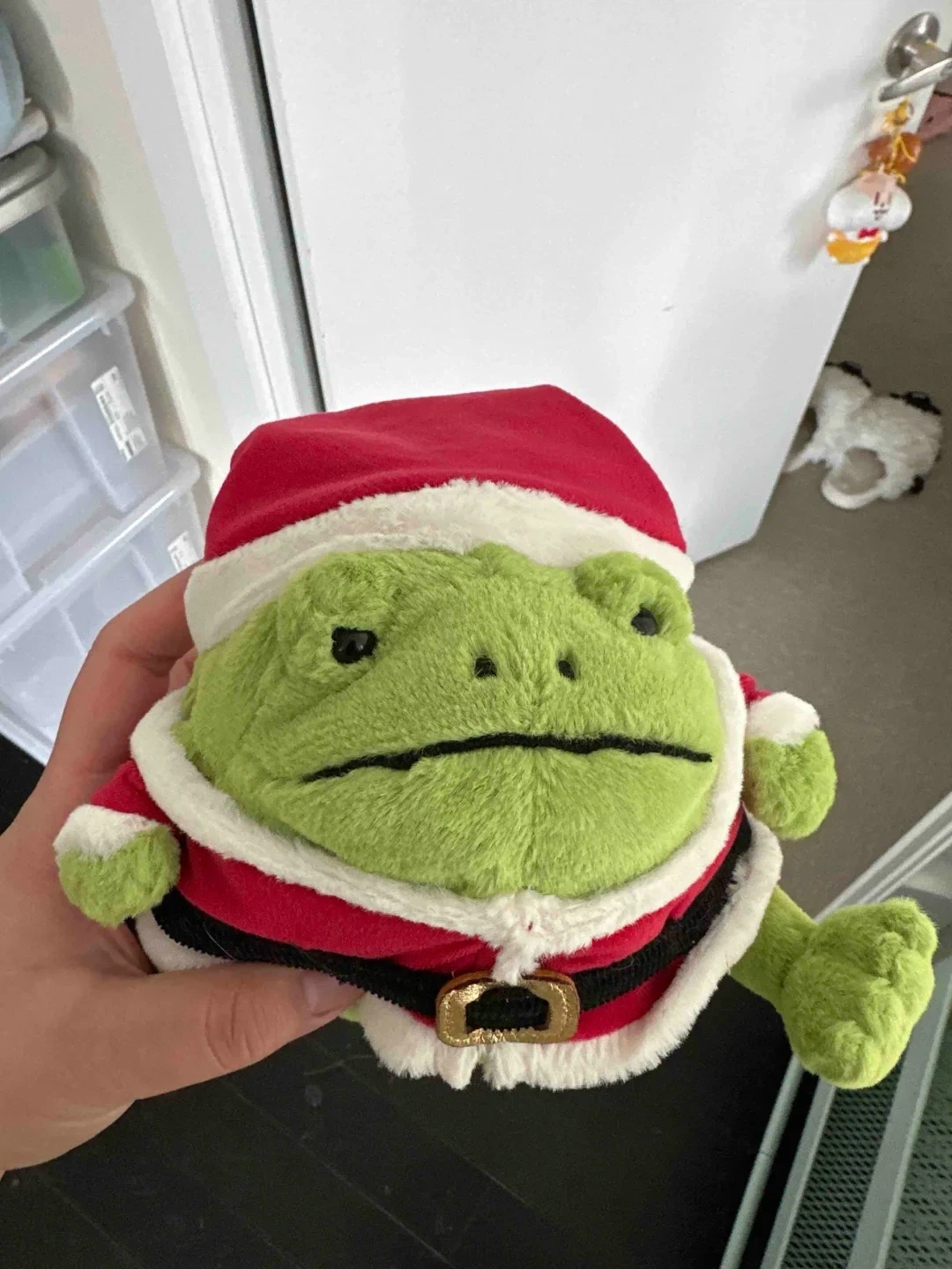 This Jellycat plush toy features a frog dressed in a Santa suit. It's made of soft, green plush material. This would make a fun holiday gift for someone who loves unique stuffed animals!
