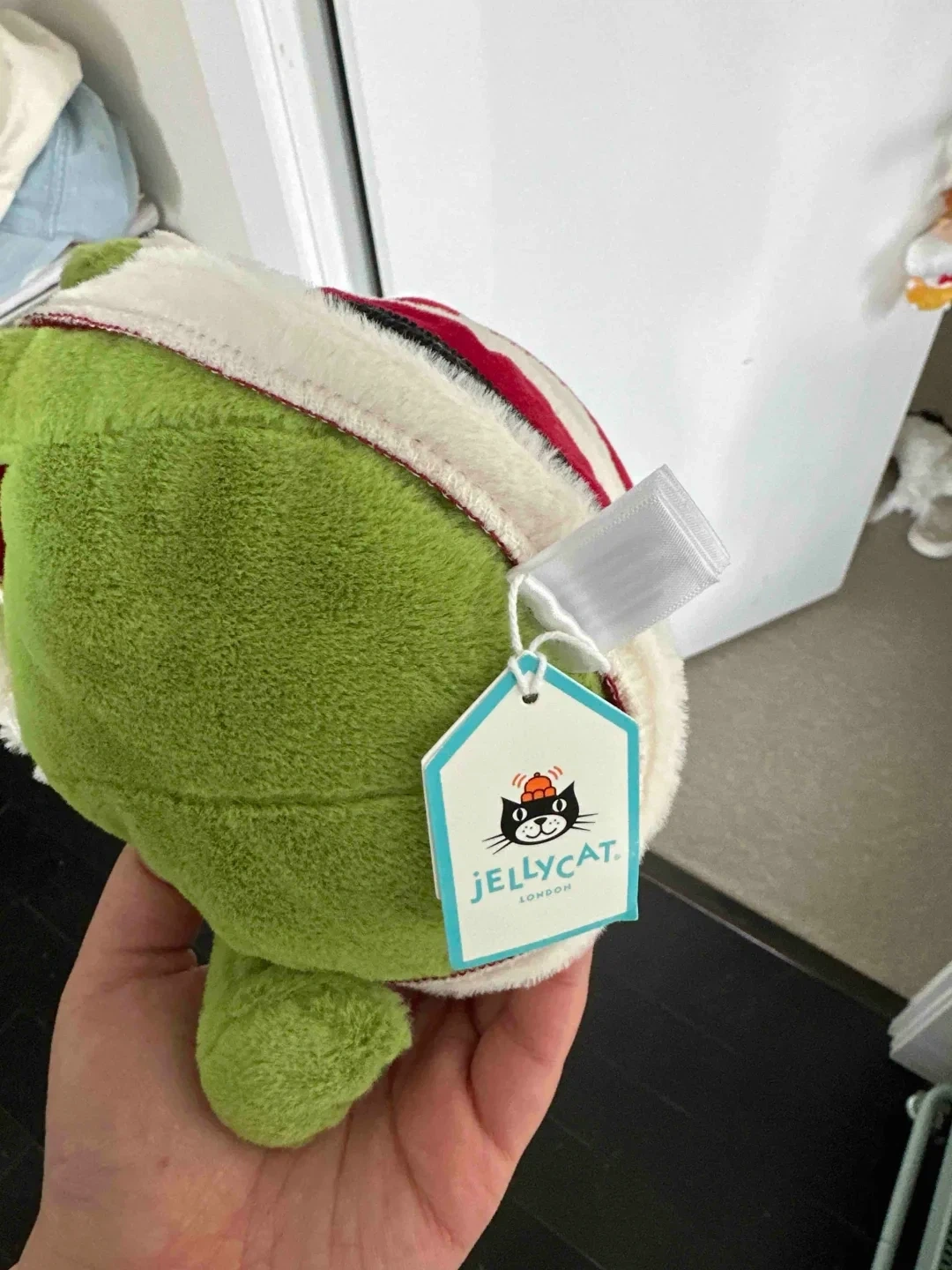 This Jellycat plush toy features a frog dressed in a Santa suit. It's made of soft, green plush material. This would make a fun holiday gift for someone who loves unique stuffed animals!