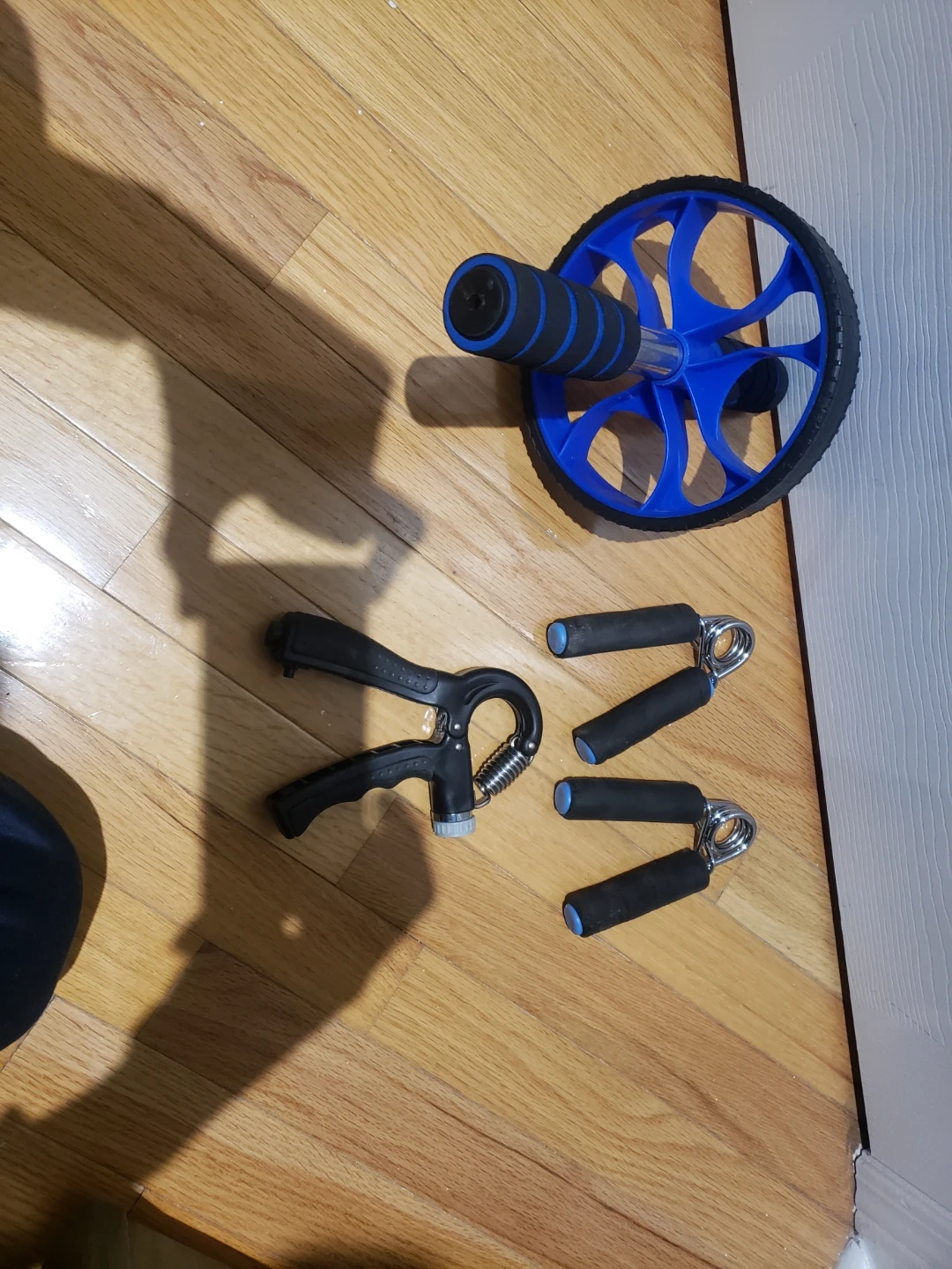 This set includes a blue and black ab roller wheel with padded handles for comfort. It also comes with three hand grip strengtheners. These tools are great for building core strength and improving grip.
