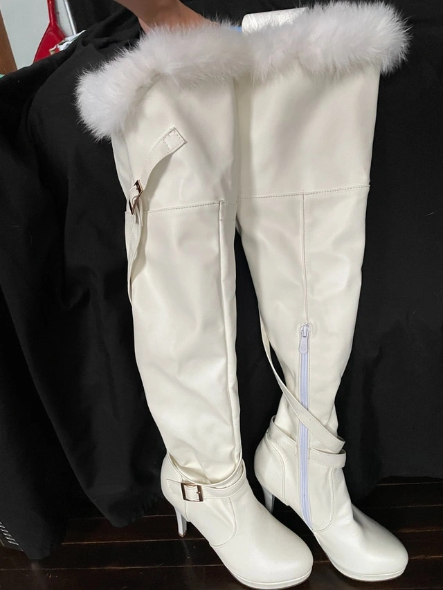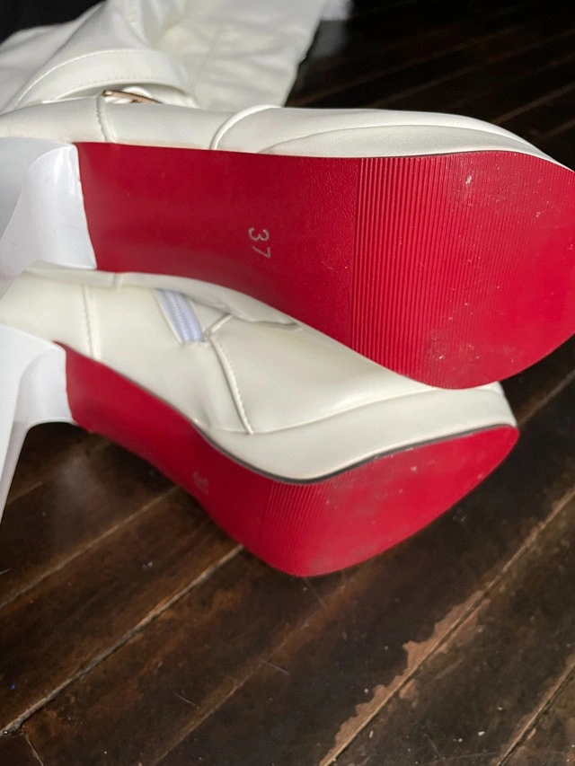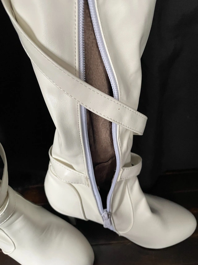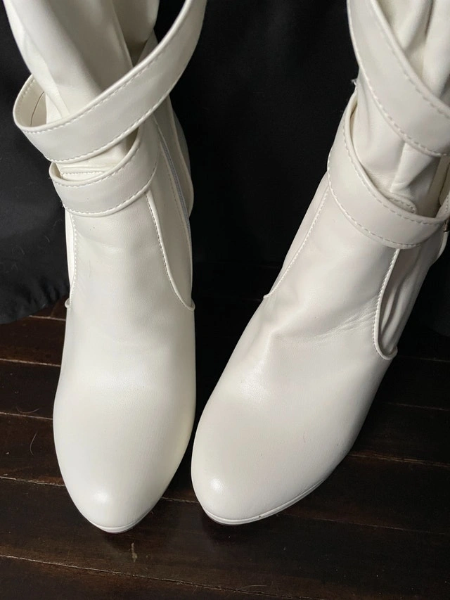 1) White knee-high boots, size 7, faux fur-trimmed and soft fleecy interior, feels great to wear. Heel approx. 4 inches.