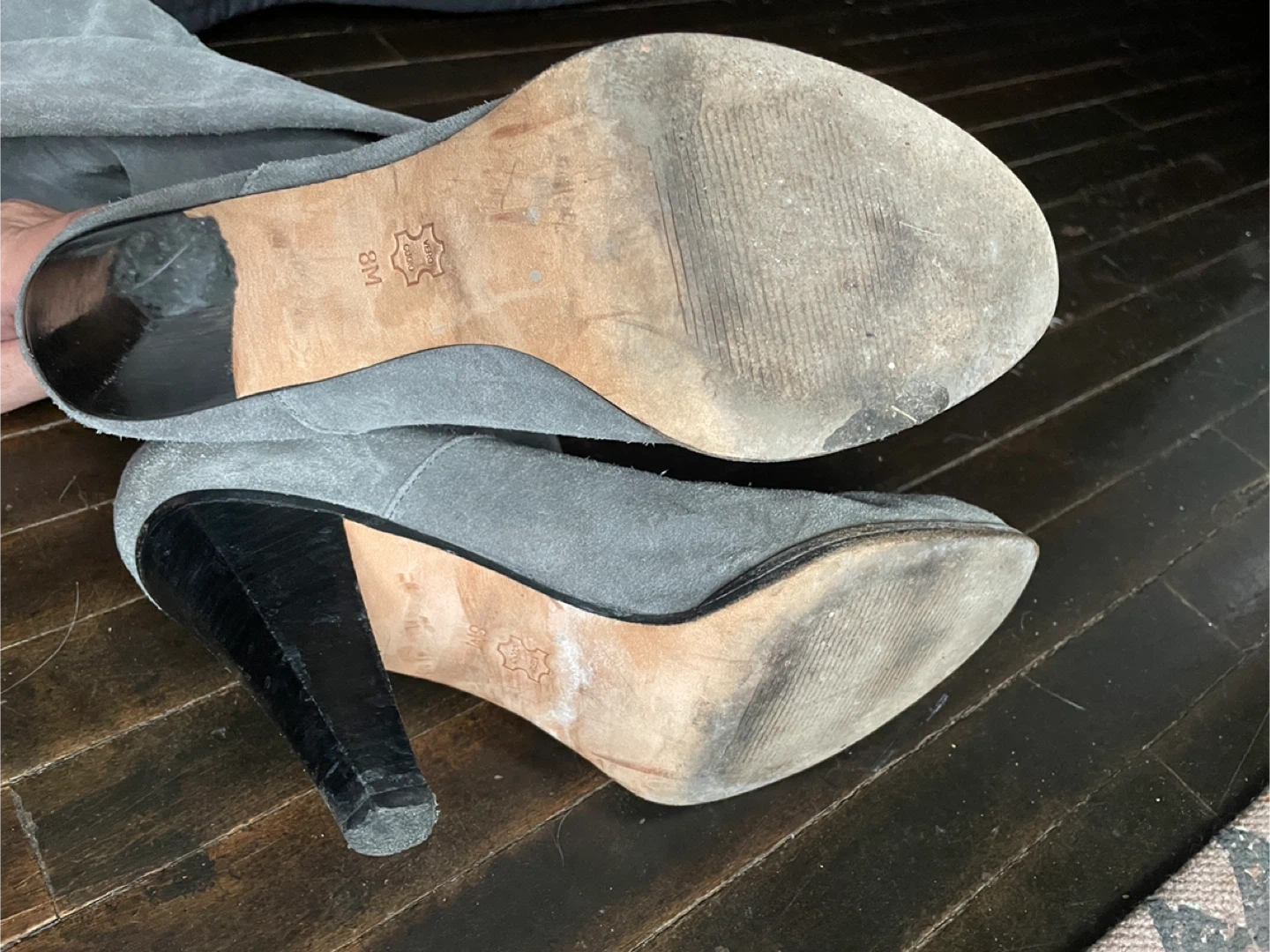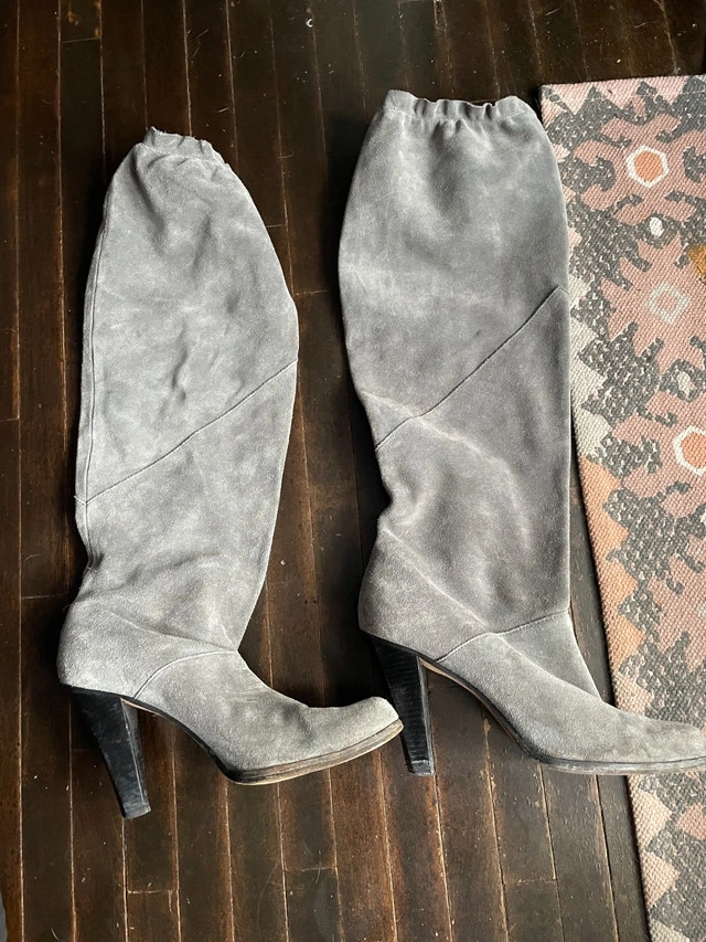 2) Gray knee-high real suede boots, size 8M, heel approx. 3.5 in, some signs of wear (like on the toe)