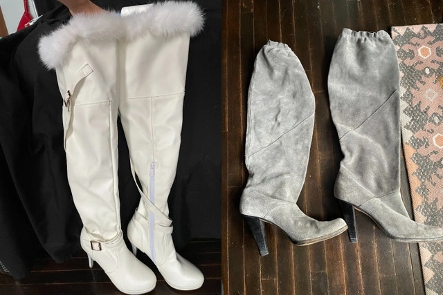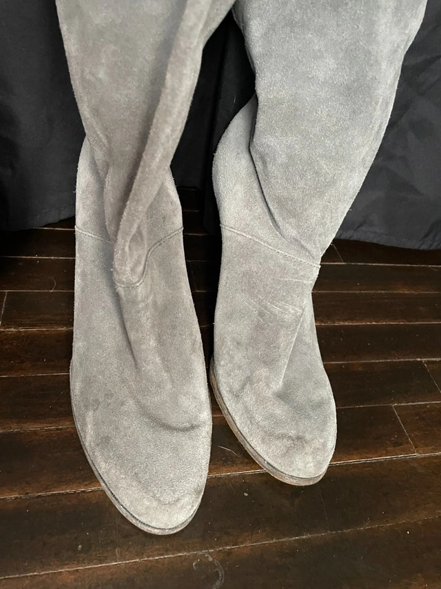 2) Gray knee-high real suede boots, size 8M, heel approx. 3.5 in, some signs of wear (like on the toe)