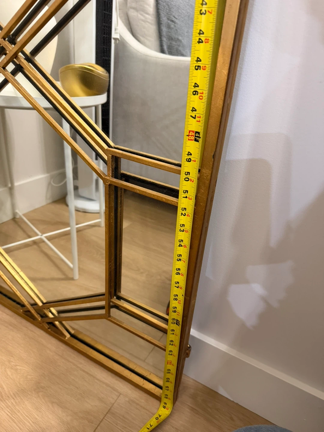 Large decorative mirror with a gold geometric frame. It's approximately 29 inches wide and 70 inches tall. This mirror's unique design adds a stylish touch to any room!