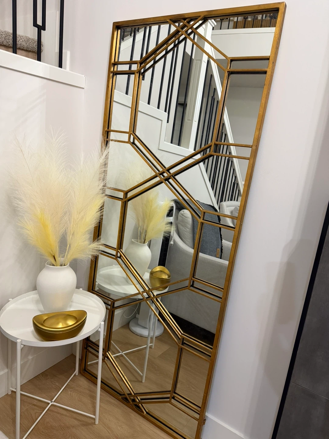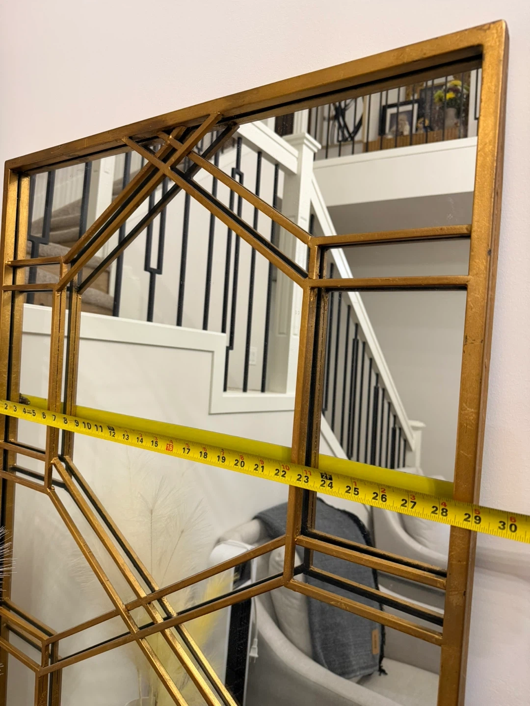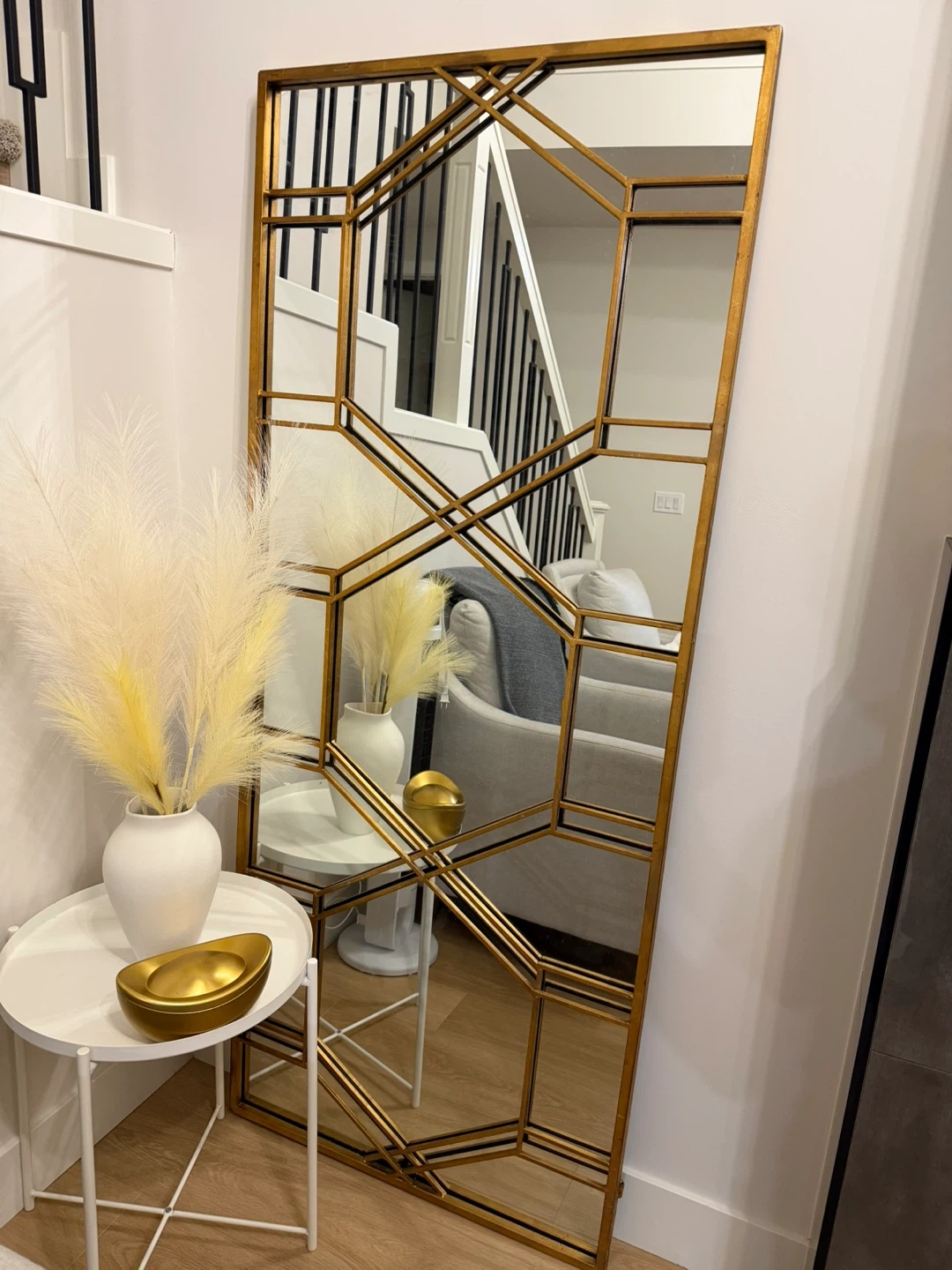 Large decorative mirror with a gold geometric frame. It's approximately 29 inches wide and 70 inches tall. This mirror's unique design adds a stylish touch to any room!