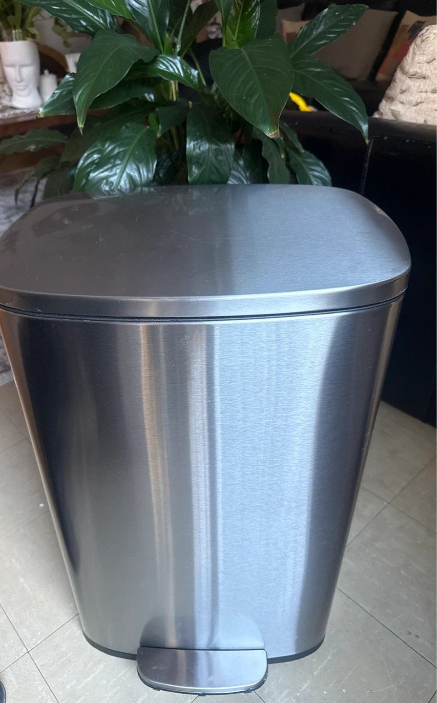 Brushed stainless steel step trash can with a removable inner bucket. Features a soft-close lid and a foot pedal for hands-free operation. Its sleek design fits well in kitchens or bathrooms.