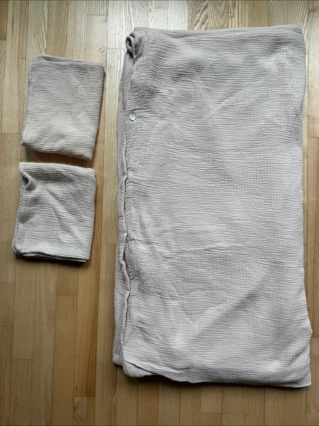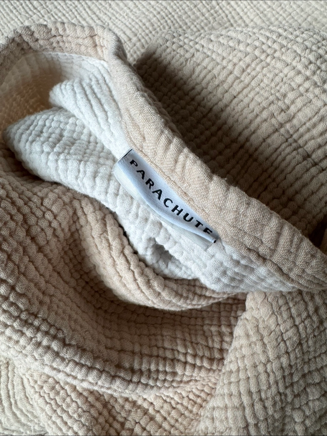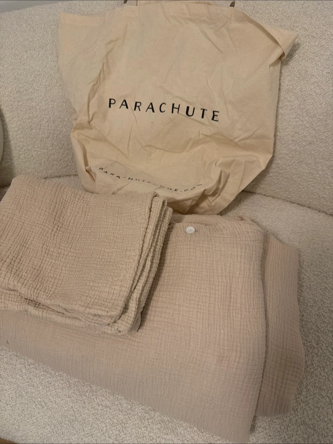 Selling a Parachute Home Queen bedding set. It includes a duvet cover and two pillowcases. The color is a beautiful neutral beige. This set is made of a soft, breathable material. Color is called dune.
