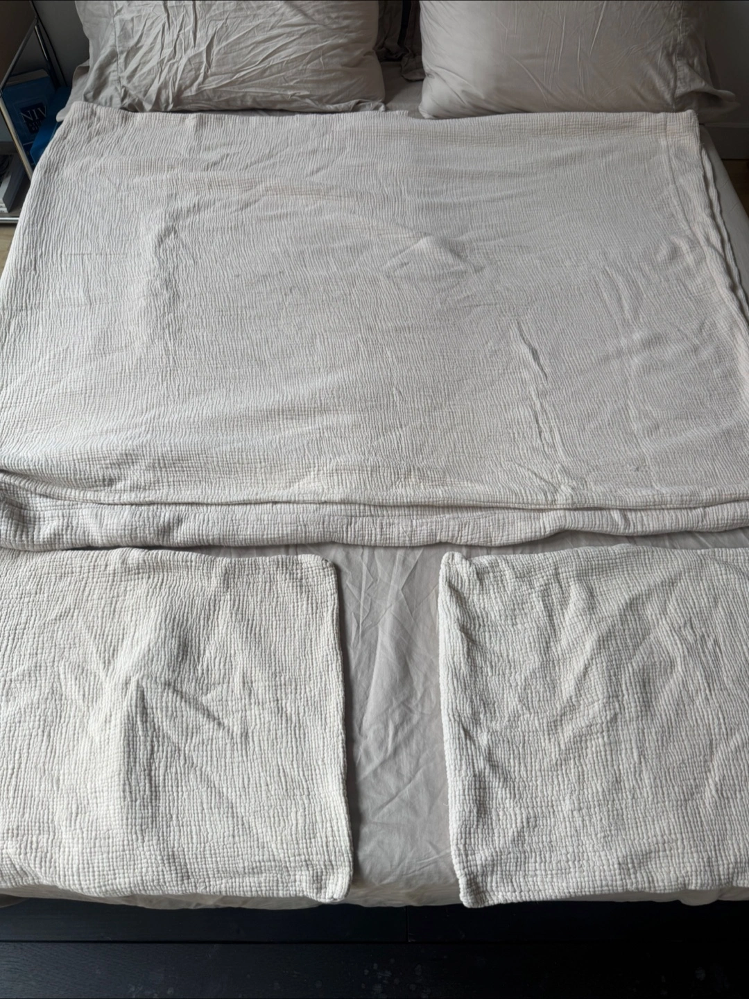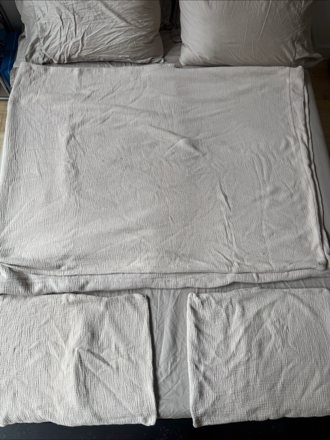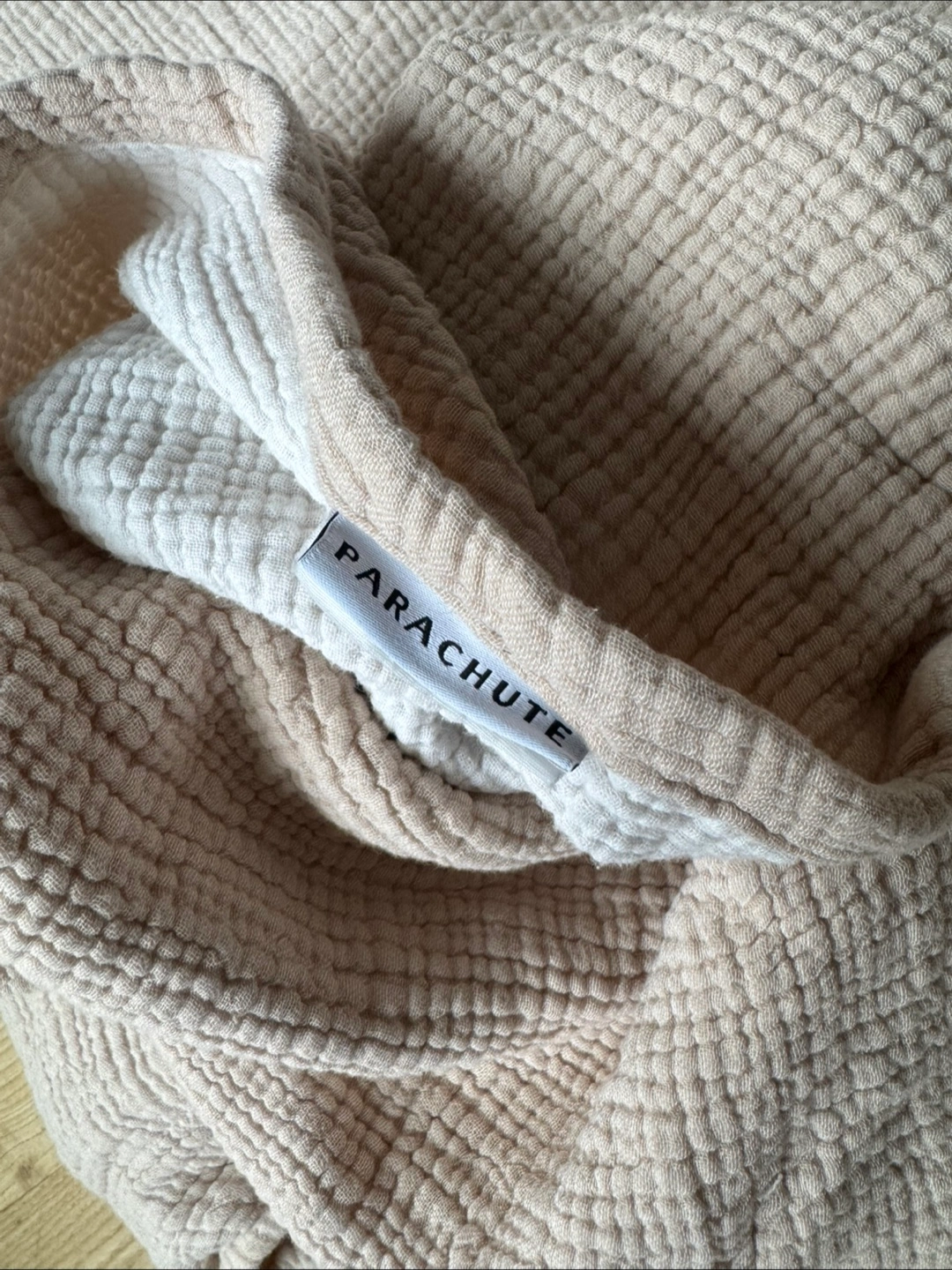 Selling a Parachute Home Queen bedding set. It includes a duvet cover and two pillowcases. The color is a beautiful neutral beige. This set is made of a soft, breathable material. Color is called dune.