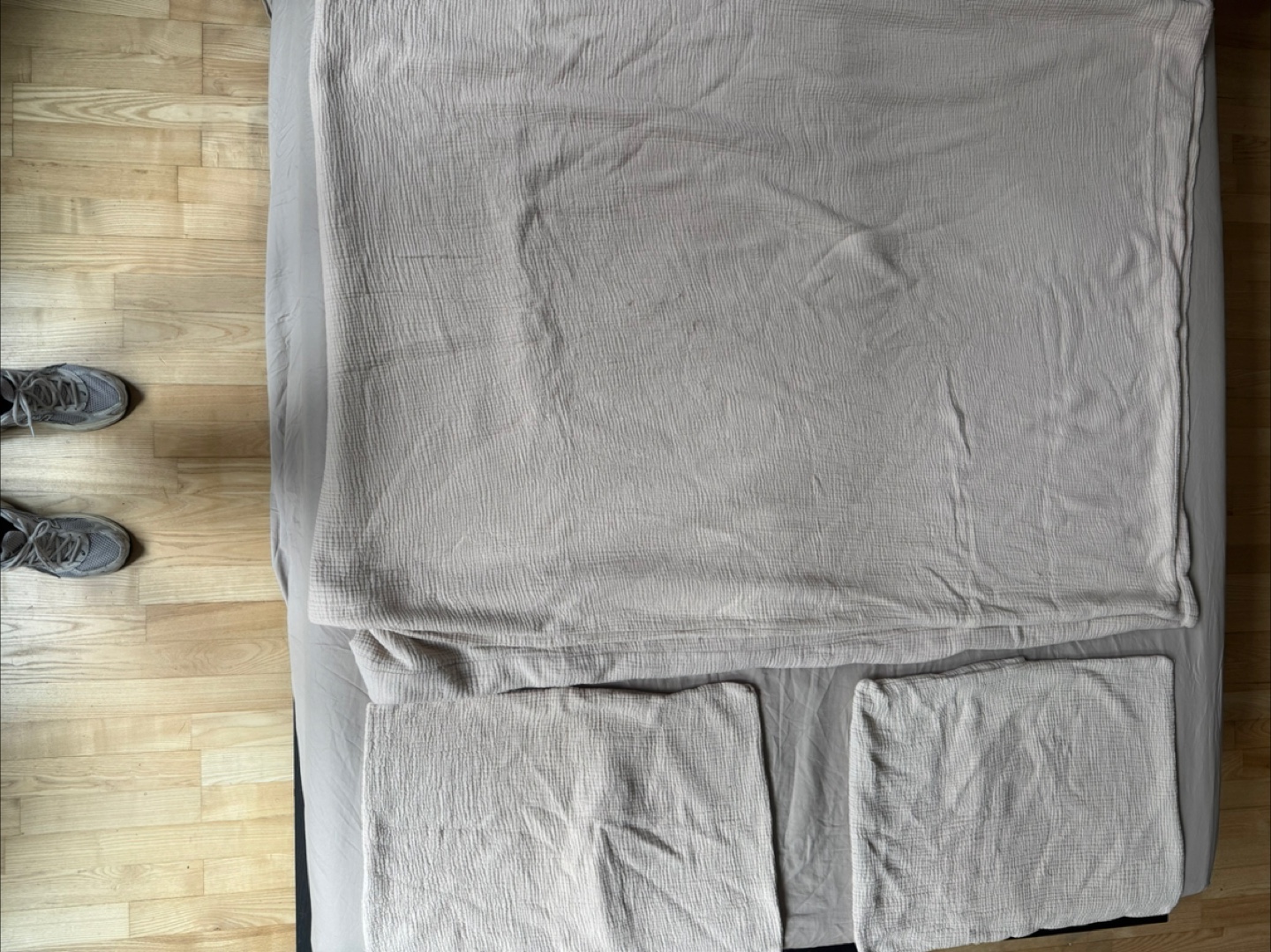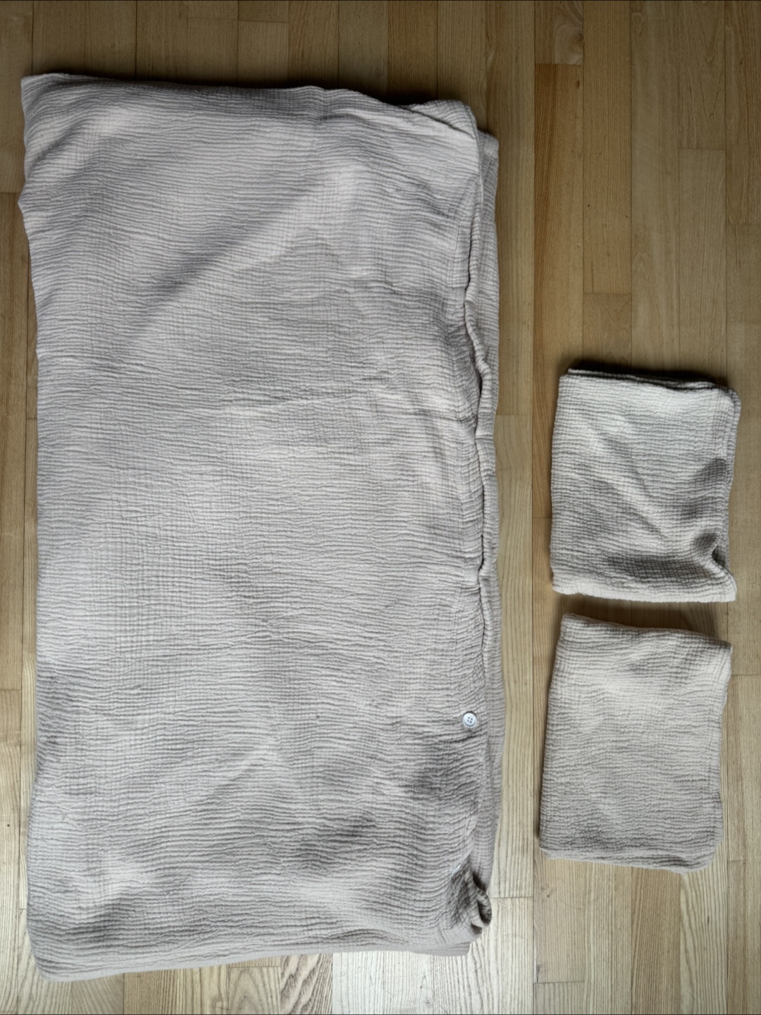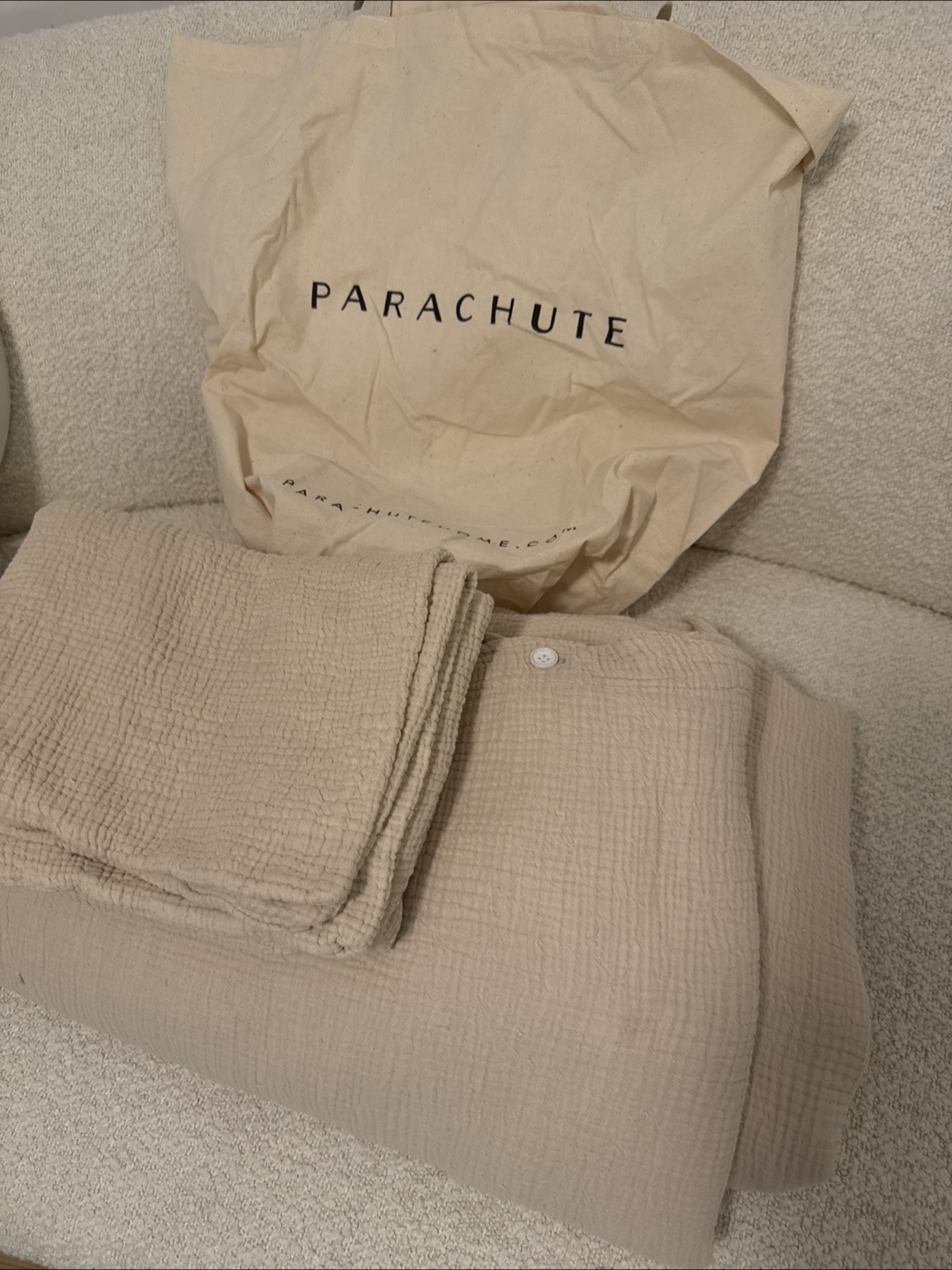 Selling a Parachute Home Queen bedding set. It includes a duvet cover and two pillowcases. The color is a beautiful neutral beige. This set is made of a soft, breathable material. Color is called dune.
