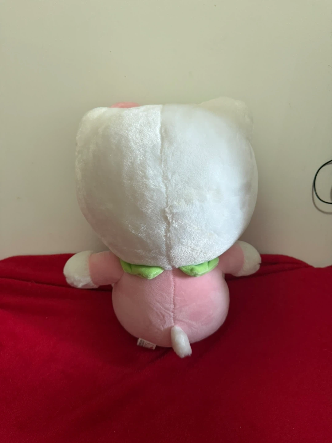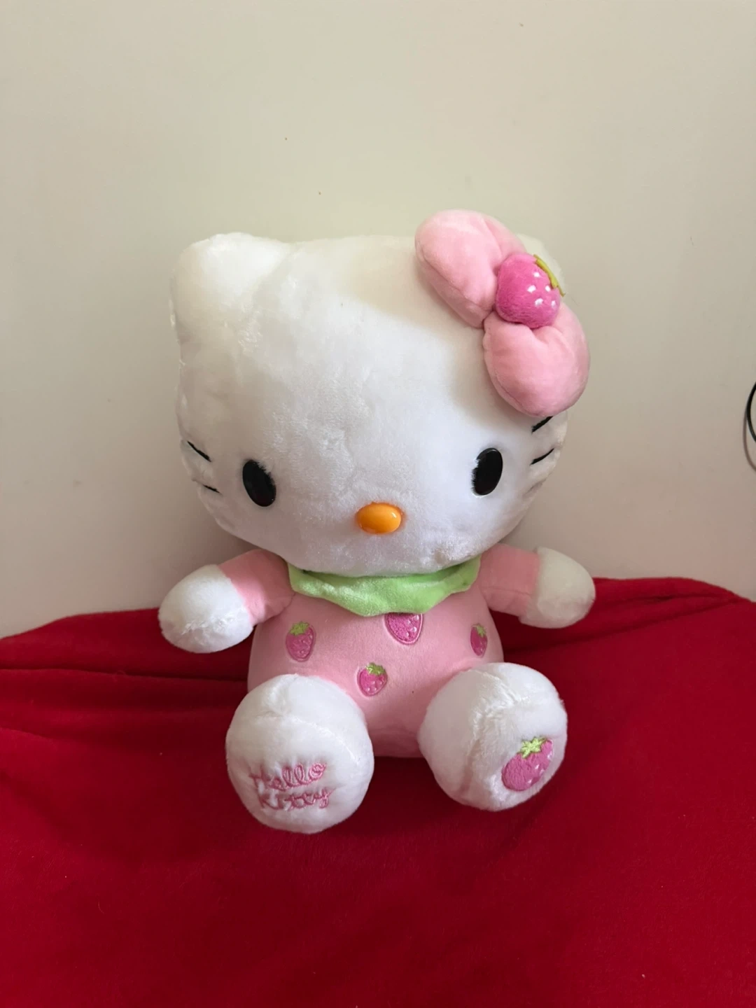 This is a super soft Hello Kitty plush toy. It's white with a pink outfit adorned with strawberry patterns and a matching pink bow. The plush has 'Hello Kitty' embroidered on one of its feet. It's a cuddly addition for any fan!