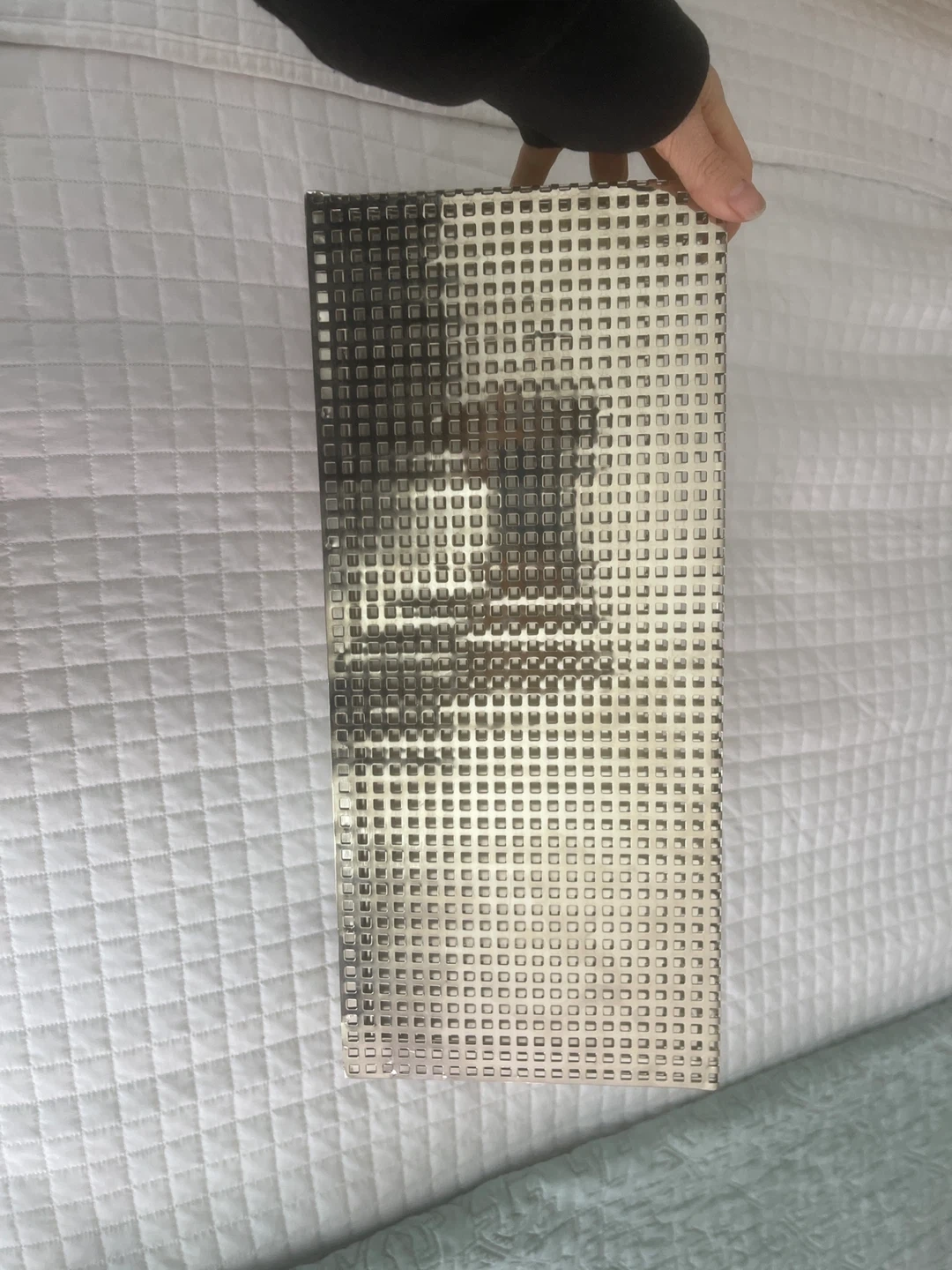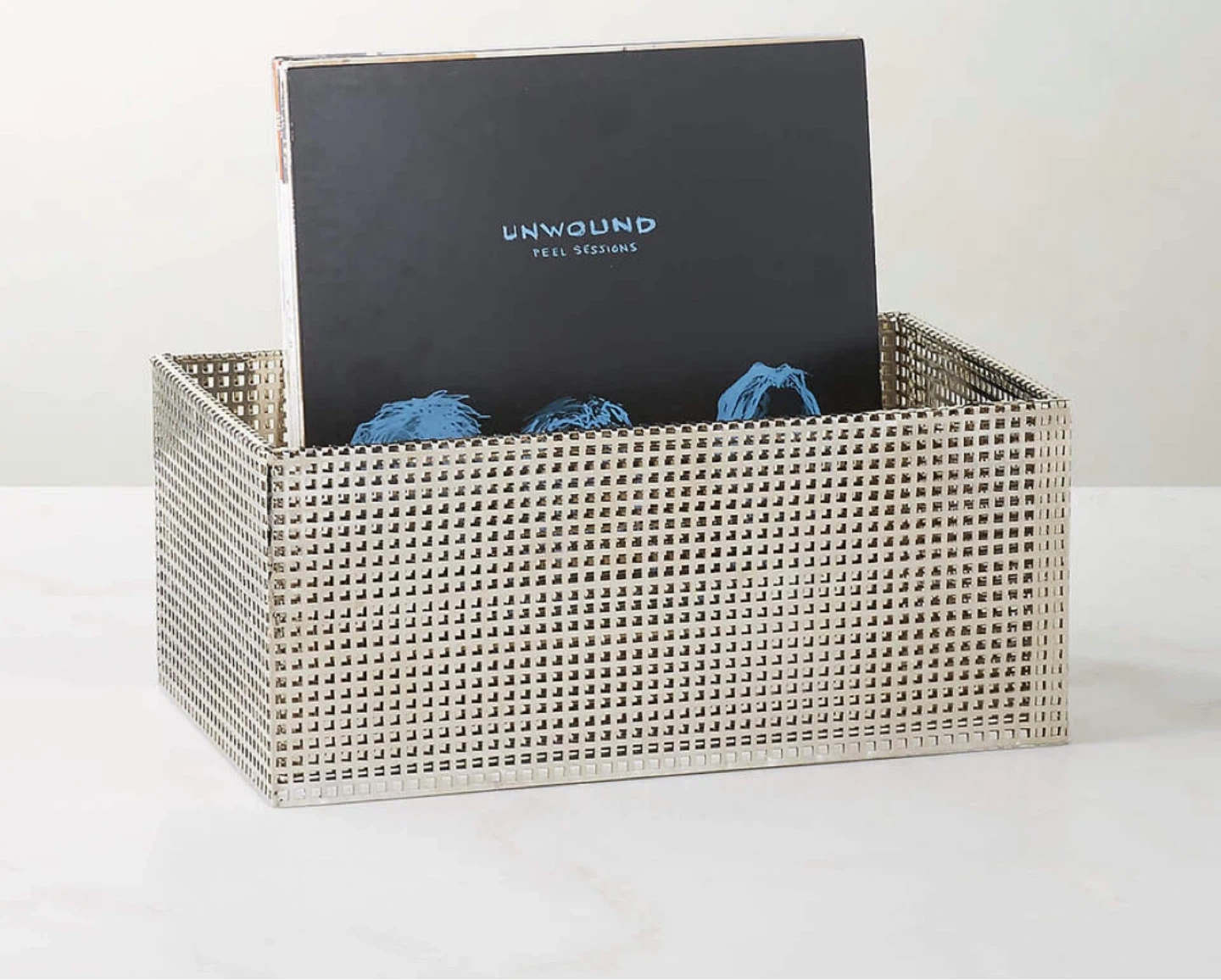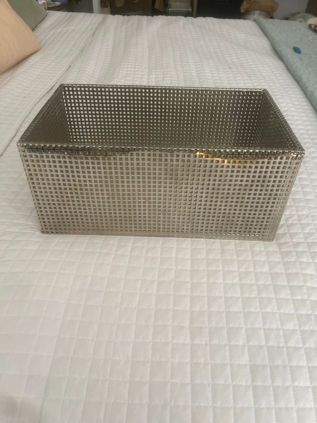 This set includes three decorative storage baskets in a shiny silver finish. They're made of a durable metal with a perforated grid design. Great for organizing items on shelves or in closets!