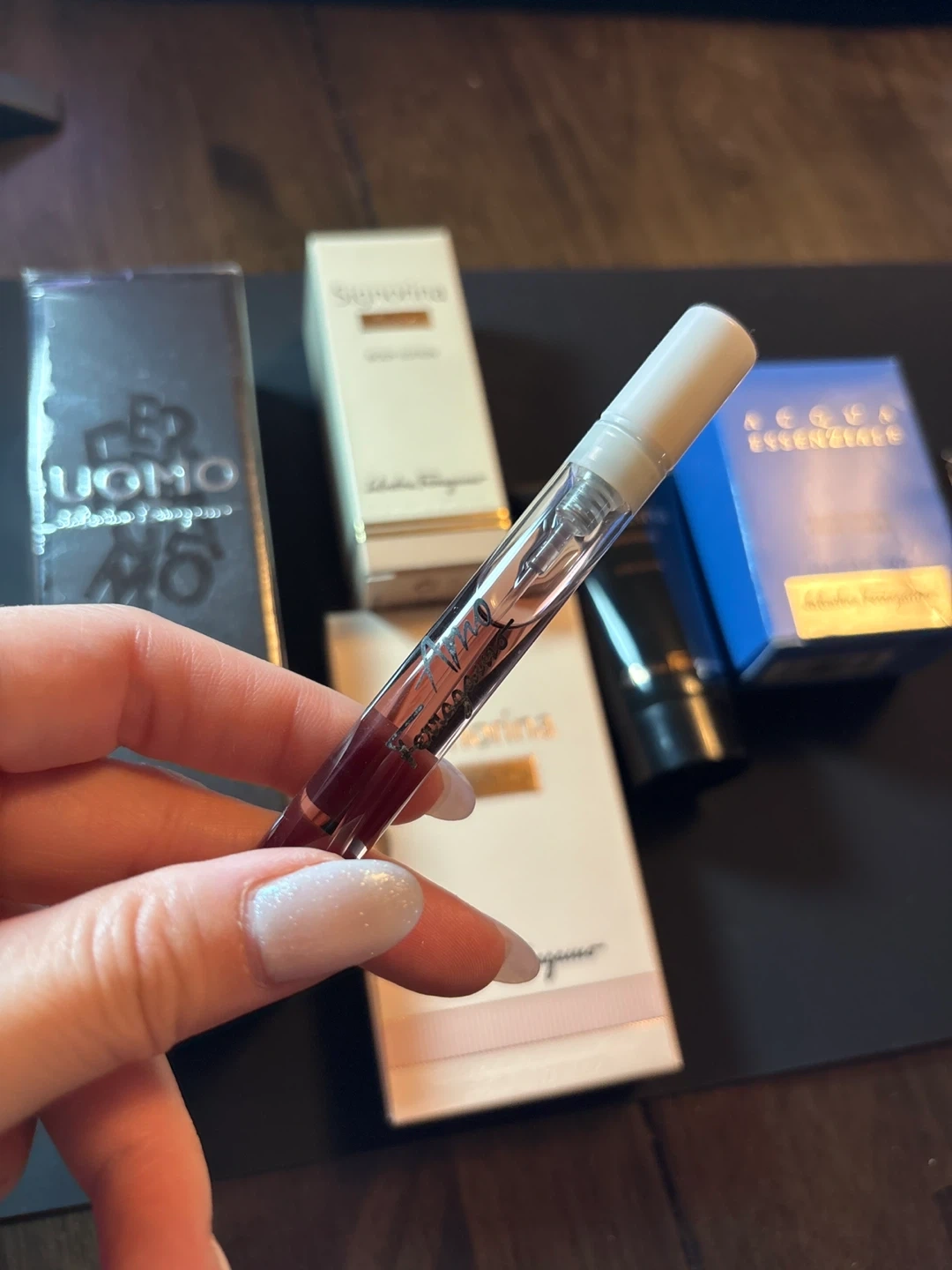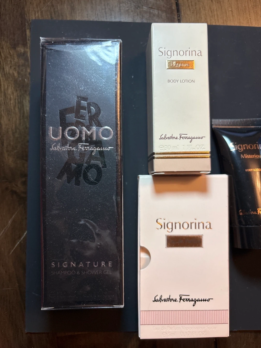 Set includes Salvatore Ferragamo Signorina Body Lotion (30ml), Acqua Essenziale Eau de Toilette (5ml), and Amo Ferragamo Eau de Parfum (5ml). Also includes Salvatore Ferragamo Uomo Shampoo & Shower Gel (unknown volume). Perfect for trying out different scents!