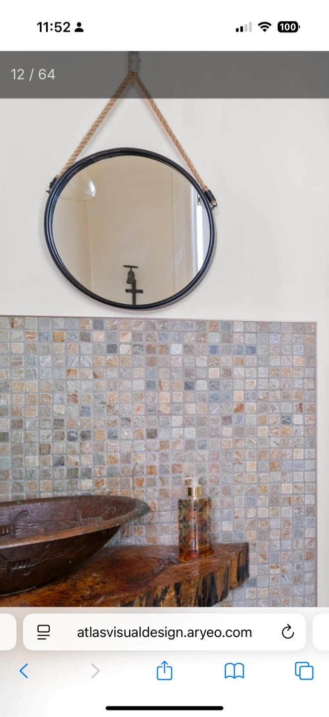 This round mirror features a black metal frame and a rope for hanging. It's perfect for adding a decorative touch to any wall. Mirror diameter is approximately 18 inches.