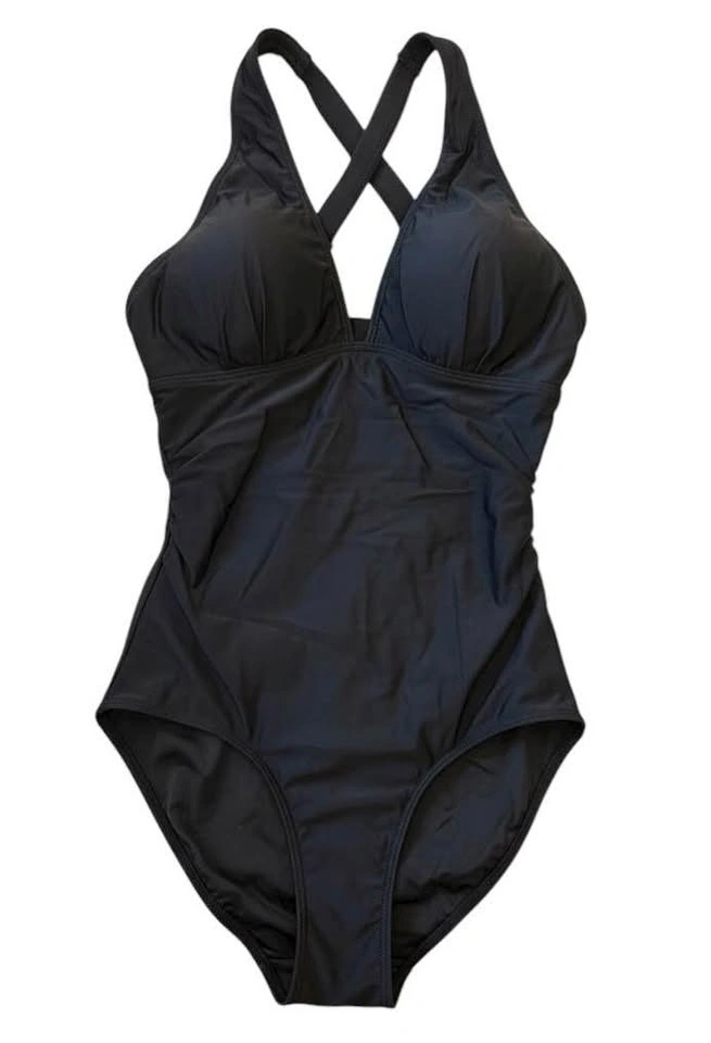 Tempt Me black one-piece swimsuit with a deep V-neckline, adjustable halter neck, and criss-cross back straps.