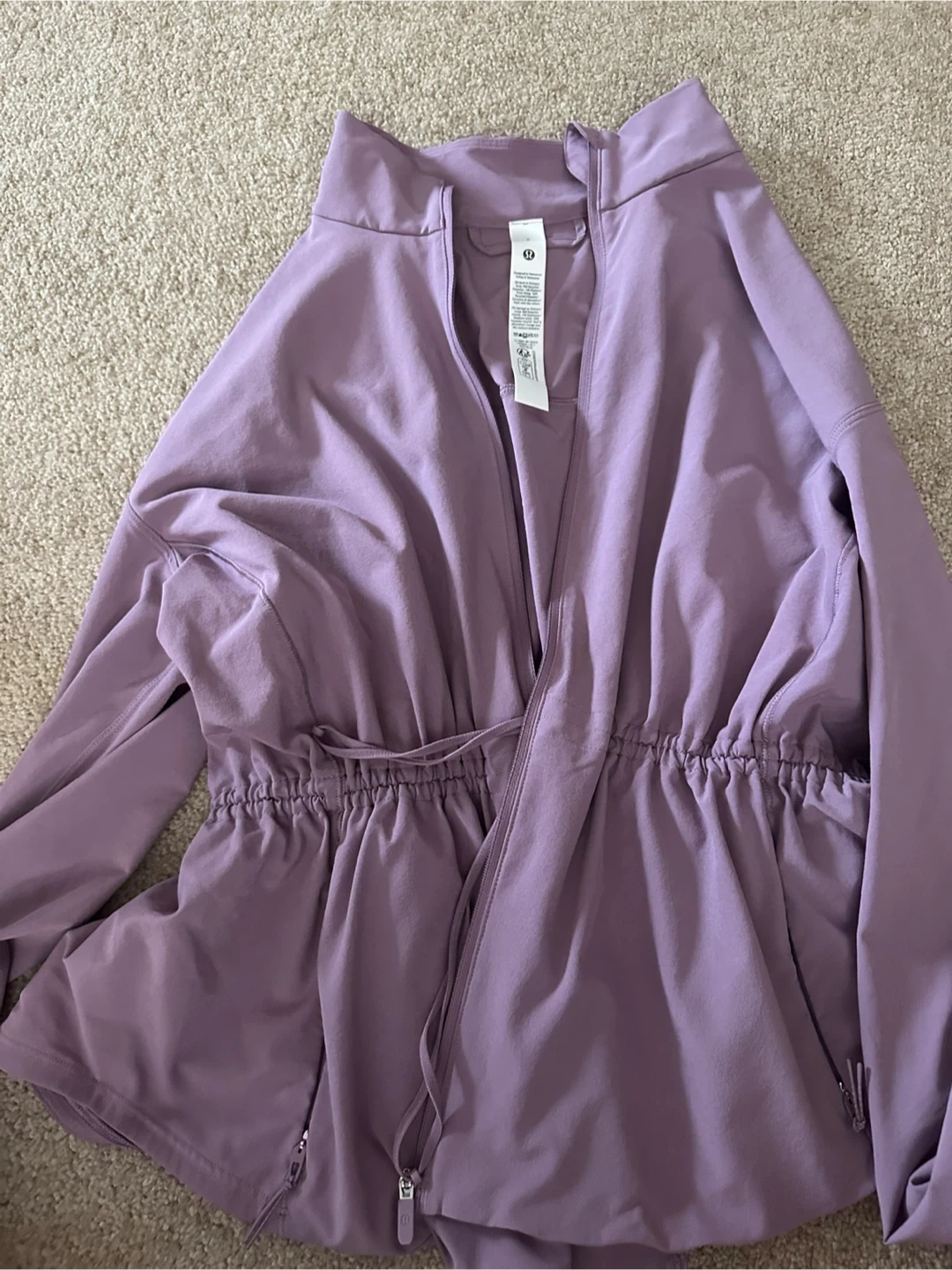 This Lululemon jacket offers UV protection and a cinched waist for a stylish fit. It's designed with a durable material and features a full zip closure. This jacket is ideal for runs or outdoor activities.