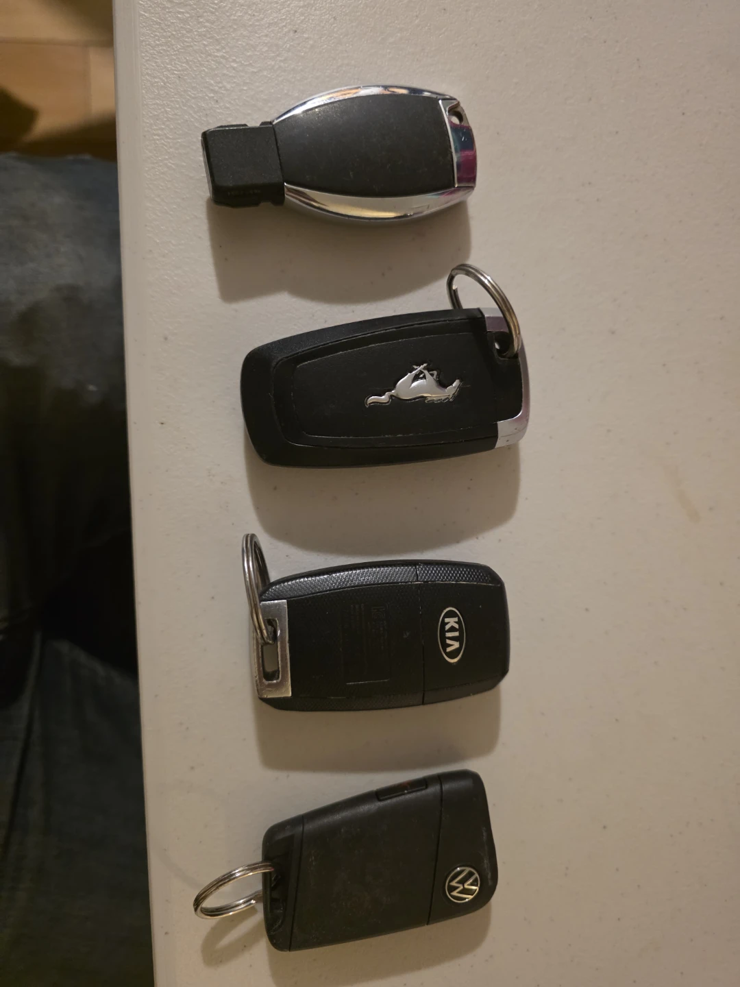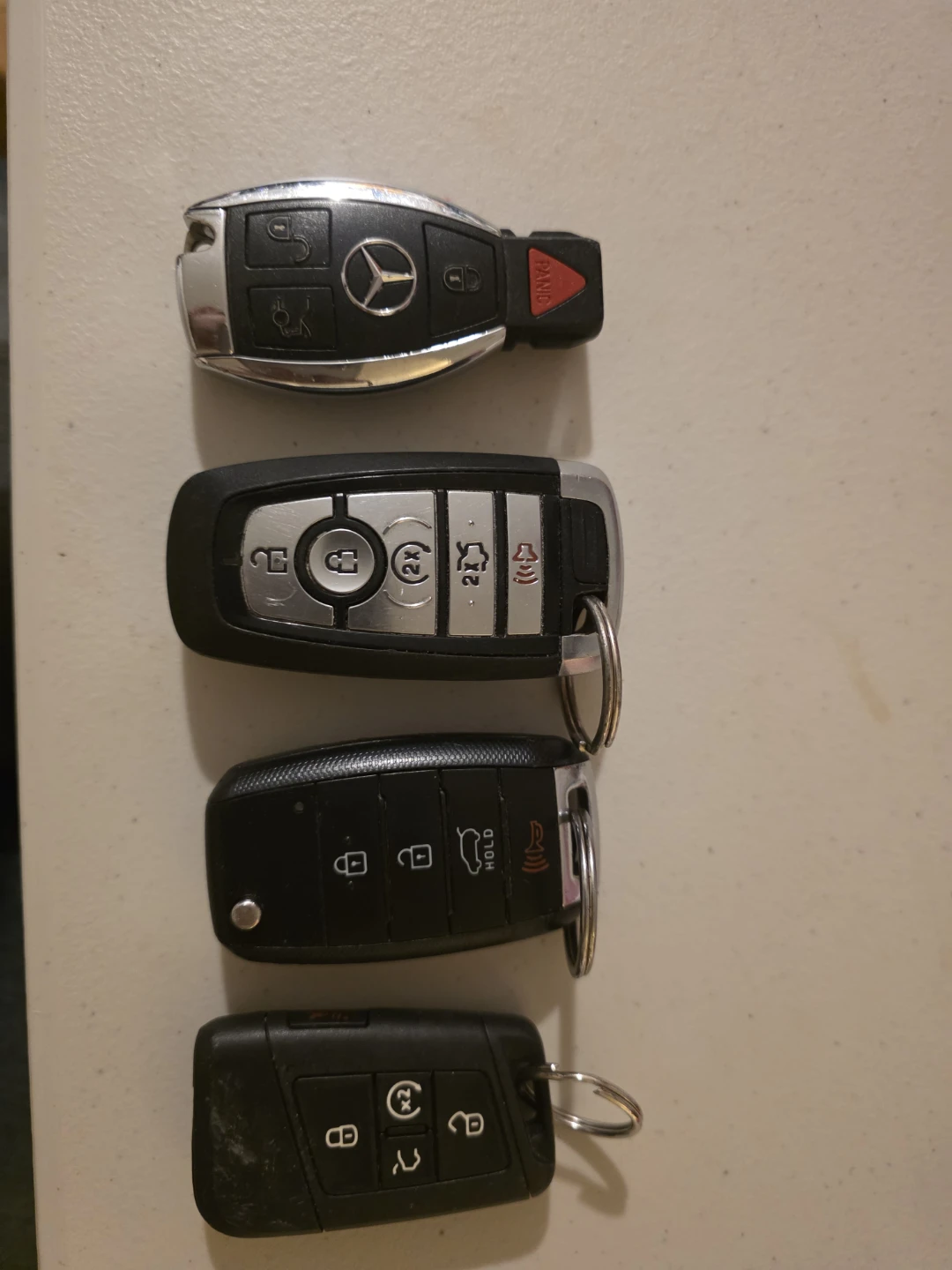 Four car key fobs are included: a Mercedes-Benz, a Ford with a start button, a Kia, and a Volkswagen. These are remote keyless entry fobs for various vehicles. They're ready for programming to your car. Probably need battery