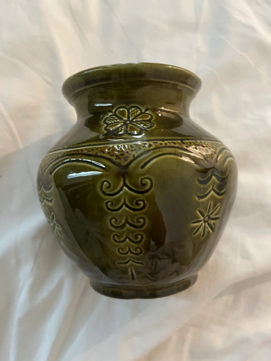 Here's a lovely green decorative vase! It has some nice floral and swirly patterns embossed on it. Perfect for adding a touch of vintage charm to your home