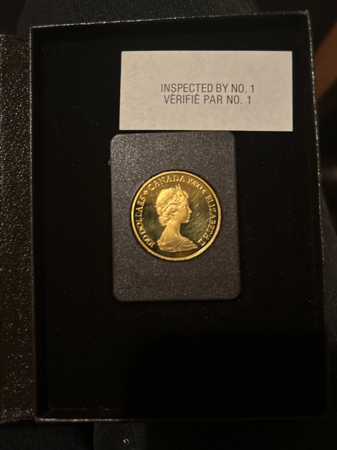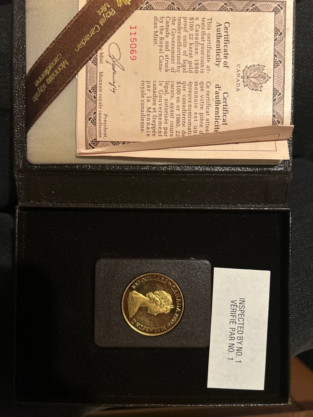 Selling a 1980 Canadian $100 22 karat gold proof coin. It comes with a certificate of authenticity from the Royal Canadian Mint. The coin is in its original box.