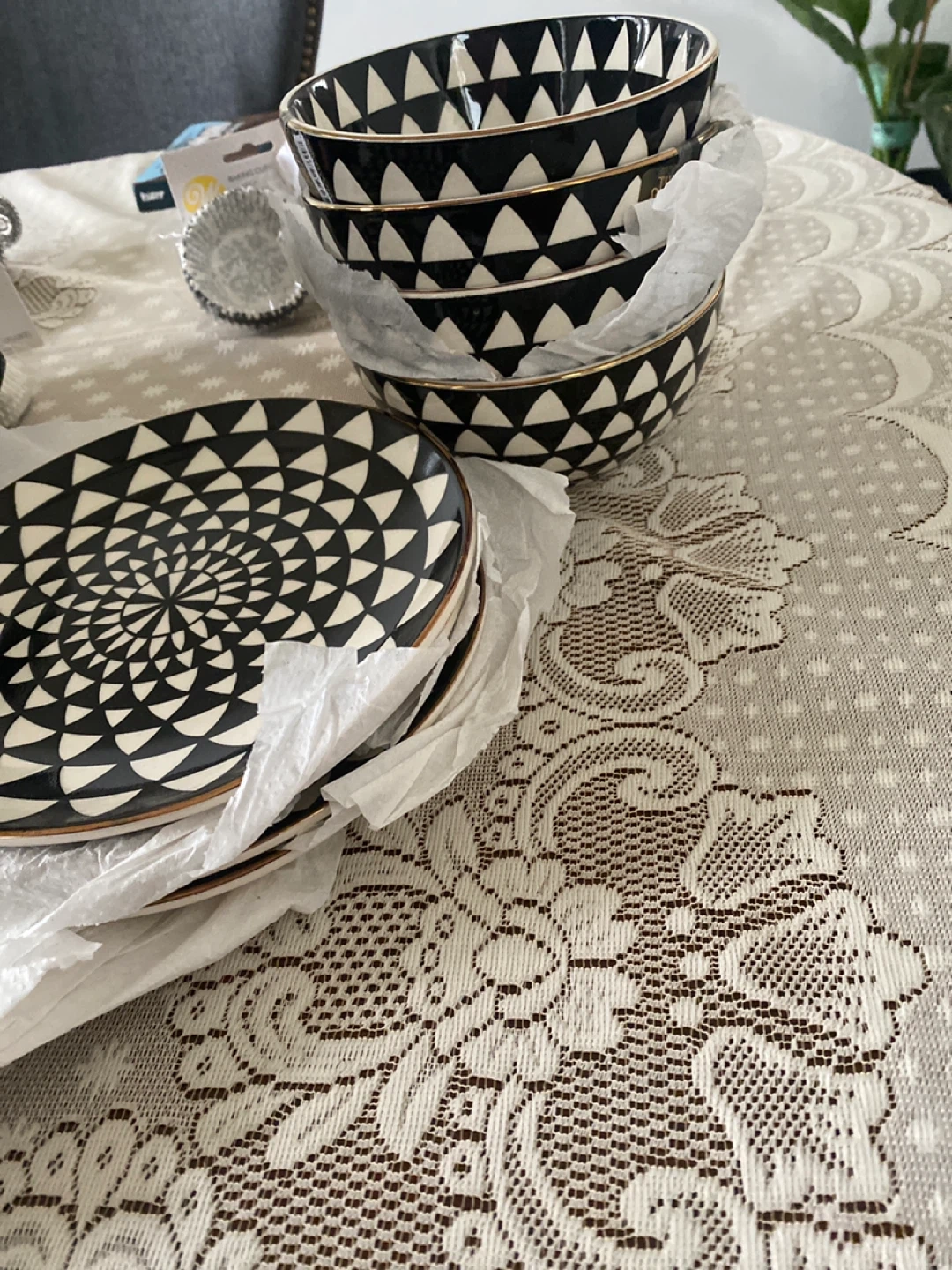 Selling a set of bowls and plates with a striking black and white pattern. They're in great condition and ready to add some style to your table! 4 medium plates and 4 bowls. $2 each or $15 for all