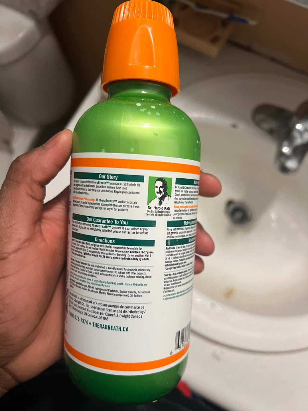 TheraBreath Fresh Breath Oral Rinse in Mild Mint flavour. Clinically shown to fight bad breath for 12 hours. No alcohol or dyes, non-burning. EXP: JL. 2028.