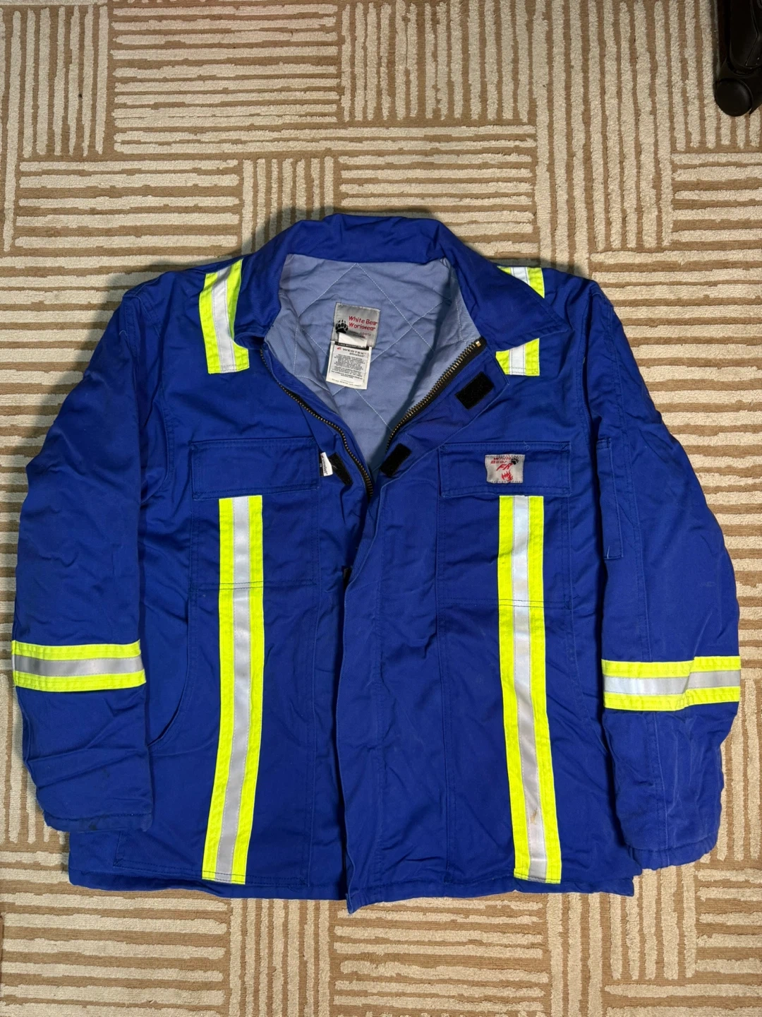 This jacket features reflective tape for increased visibility. It's flame resistant for added safety.