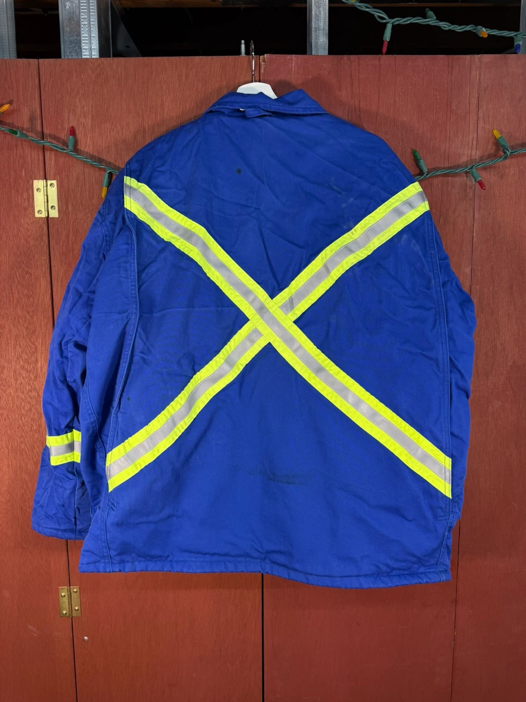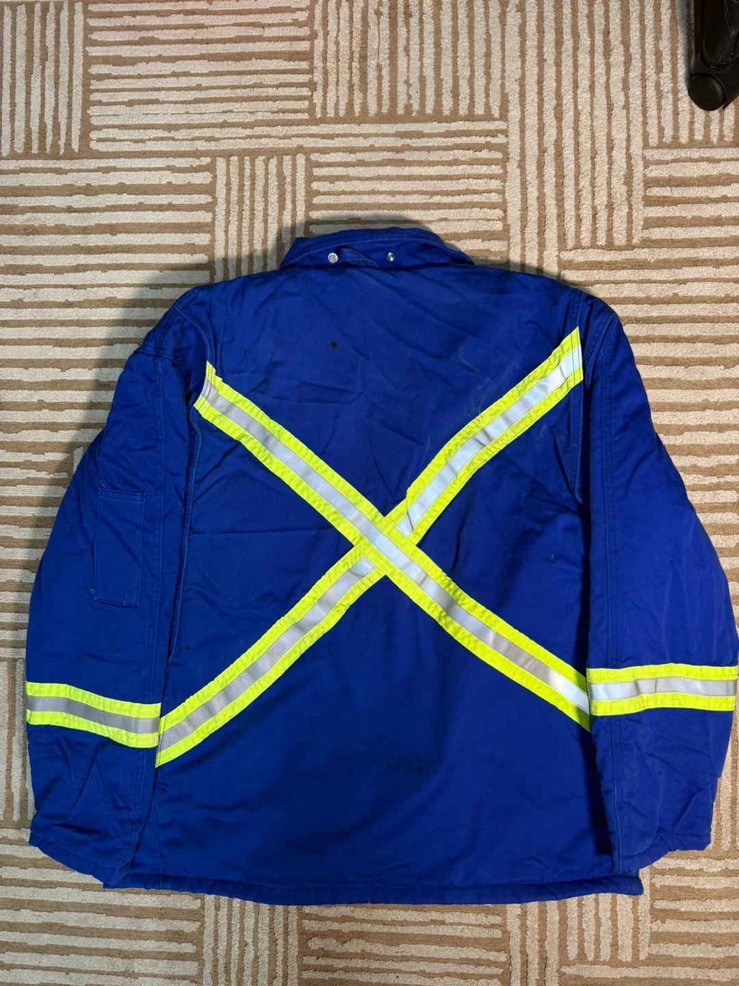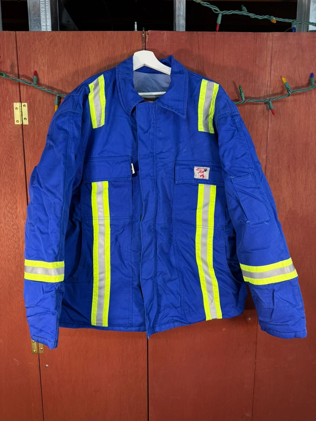 This jacket features reflective tape for increased visibility. It's flame resistant for added safety.