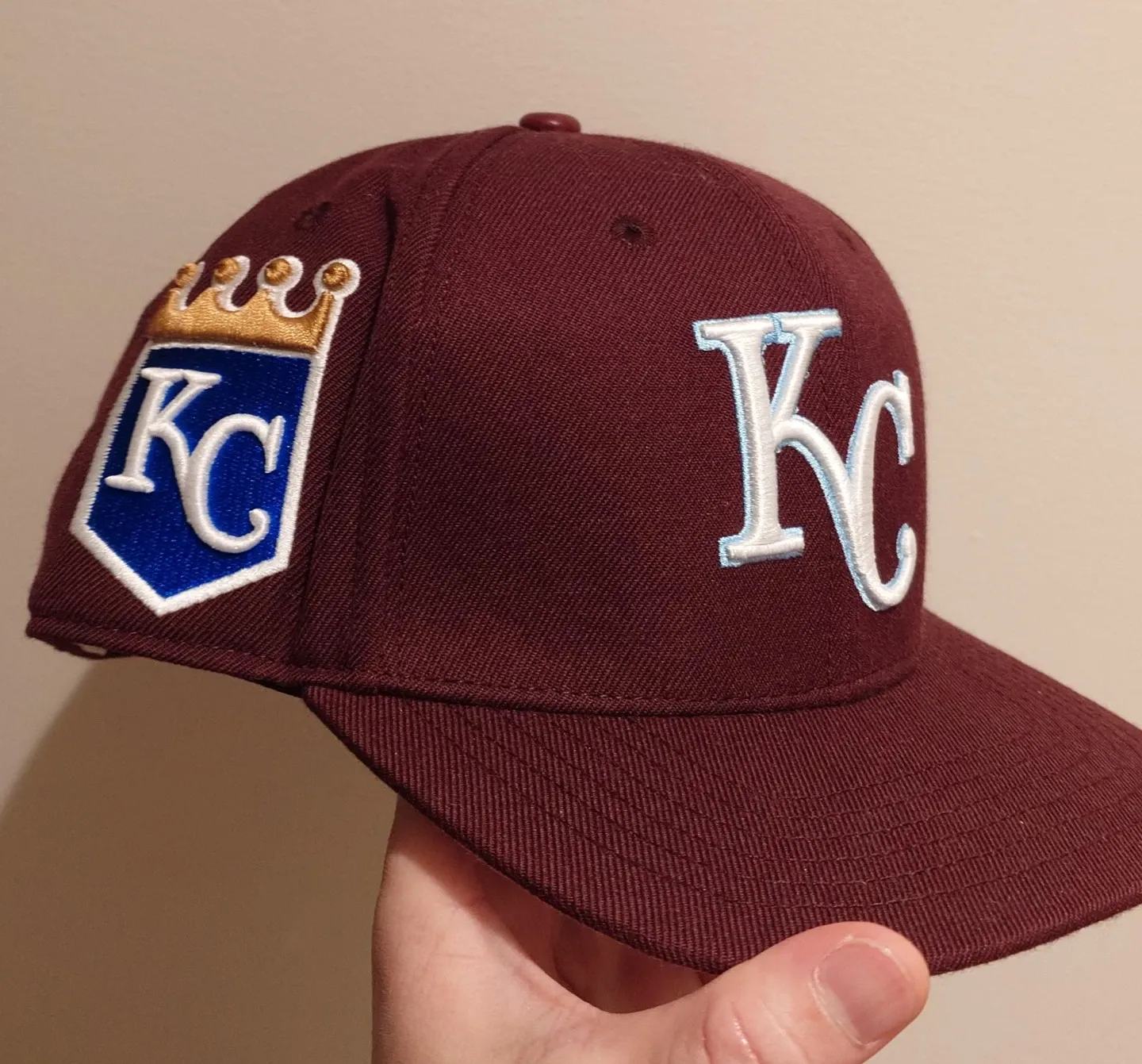 Maroon baseball cap with "KC" embroidered on the front and a "KC" crest patch on the side. It's a stylish accessory for any fan!
