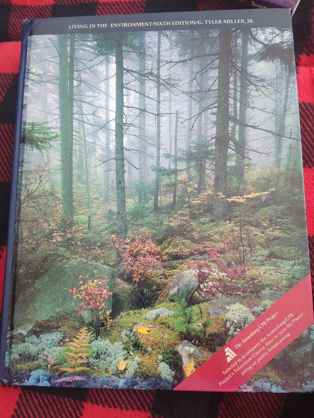 Used copy of "Living in the Environment, Sixth Edition" by G. Tyler Miller Jr. This book has some wear and tear from previous use but is still in good reading condition with all pages intact. It offers comprehensive coverage of environmental science, with detailed diagrams and illustrations, making it suitable for students and environmental enthusiasts. Cash accepted.
