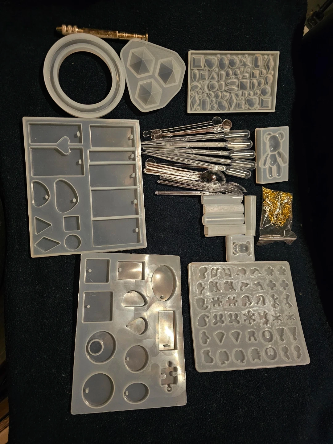 This is a set of resin casting molds for jewellery and small crafts. It includes various shapes like geometric, hearts, letters, and a teddy bear. Lots of fun for DIY projects!