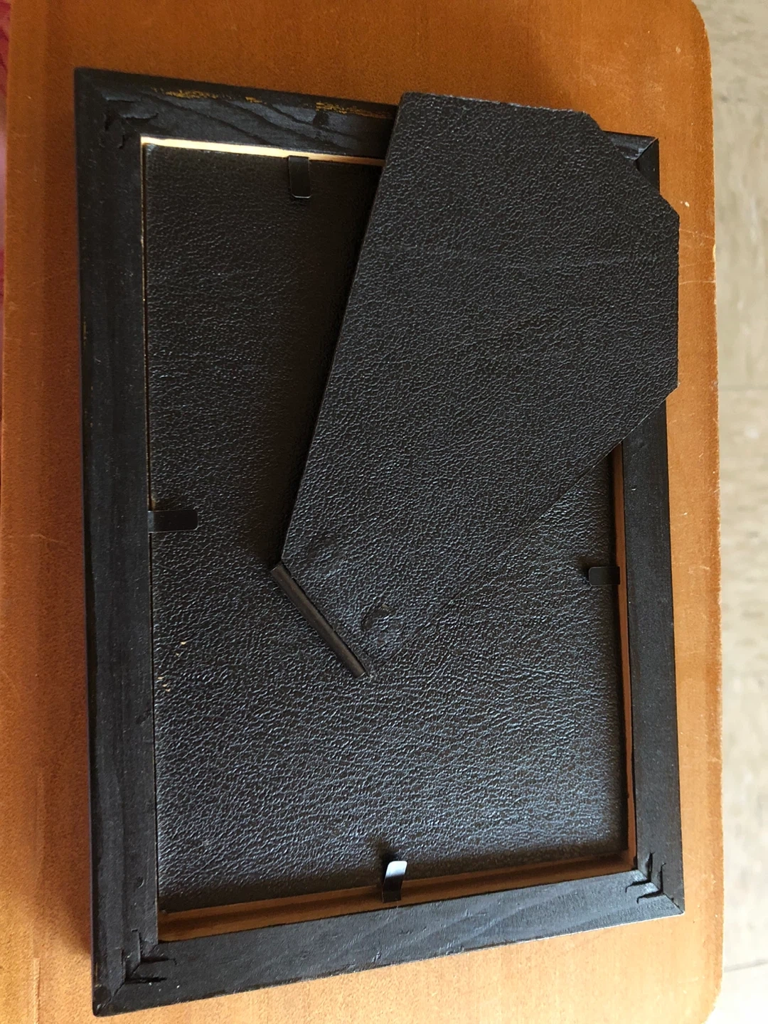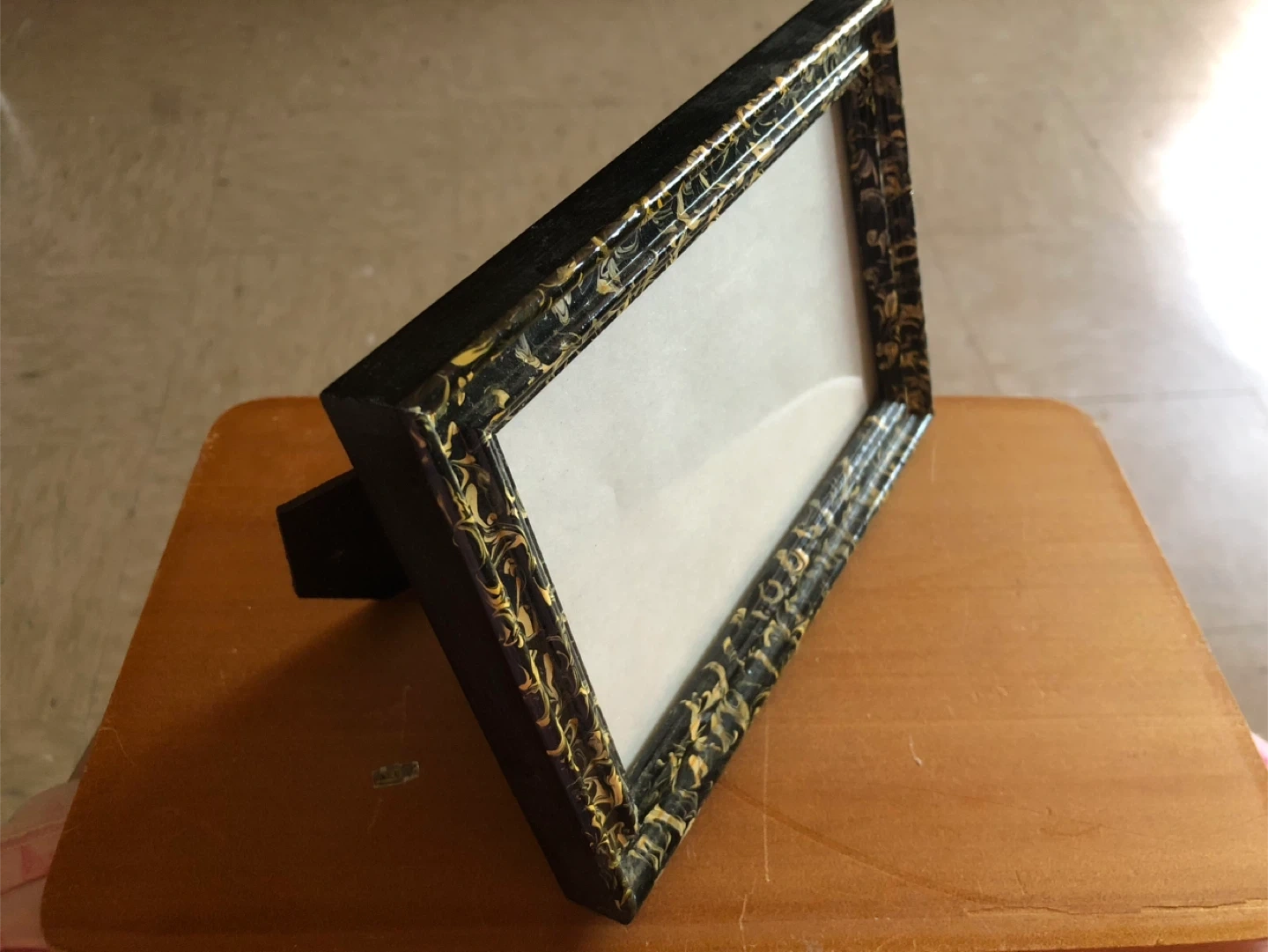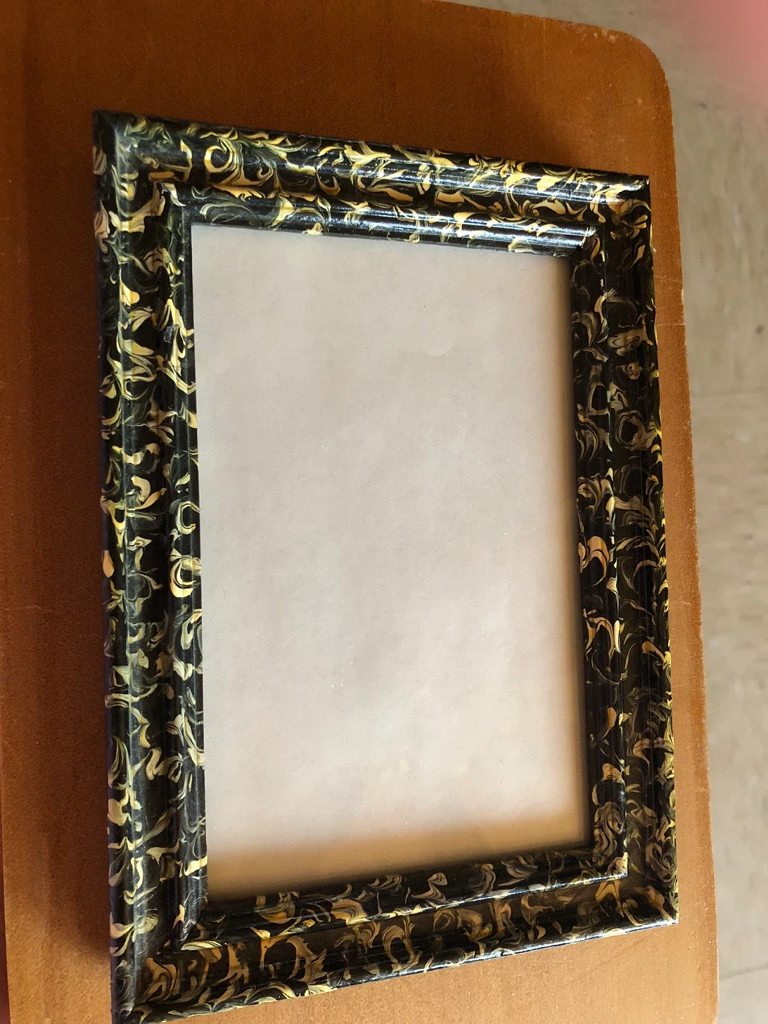 This frame has a black and gold swirled pattern. It's designed for tabletop display. Or wall. This frame holds one photo.