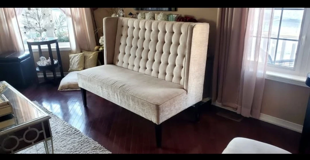 Includes a brown leather three-seater sofa and a matching armchair. Also a beige tufted bench with a high back. Coffee tables are also available. Material is leather and fabric.moving sale.prices are separate but can buy all for better price.