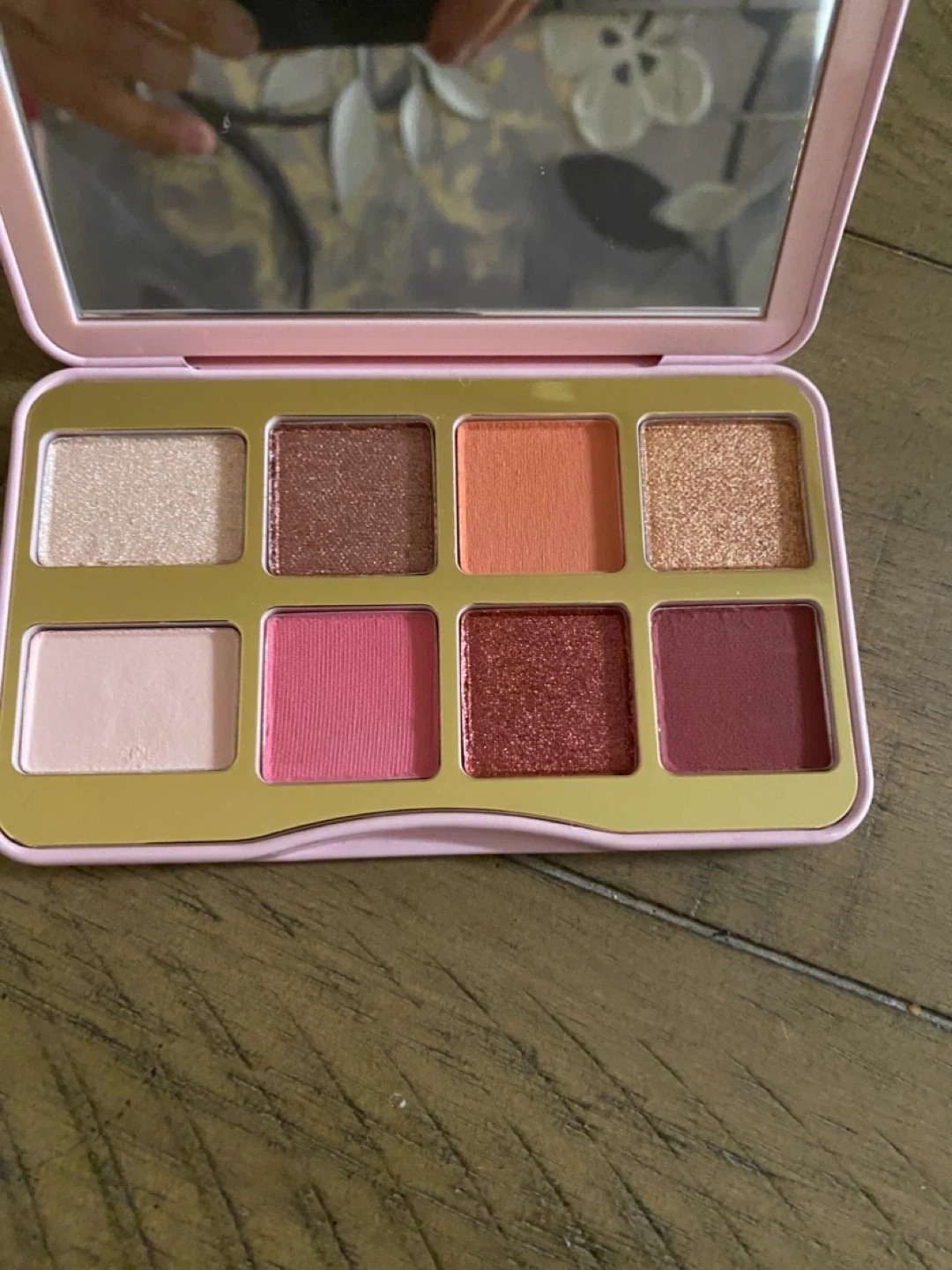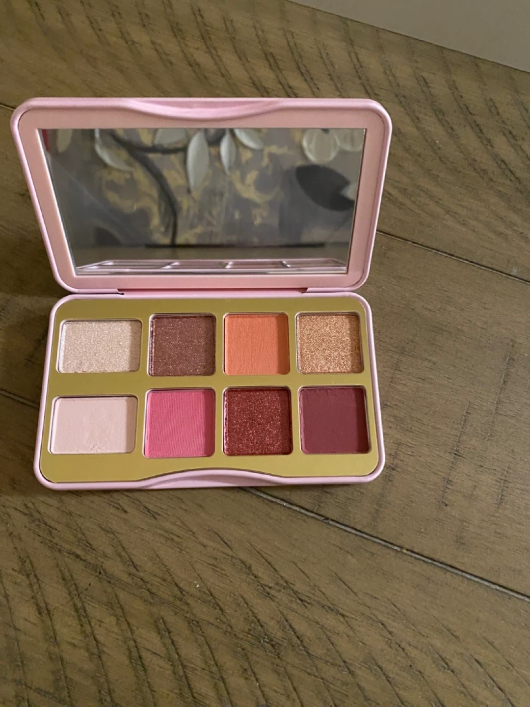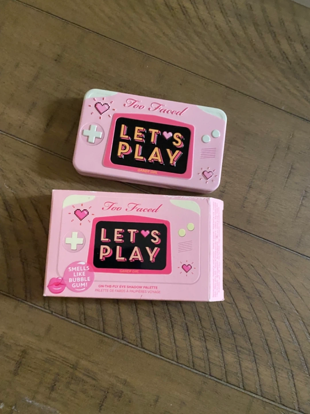 This is the Too Faced Let's Play On-The-Fly Eyeshadow Palette. It smells like bubble gum! The palette contains 8 shades of eyeshadow. It's a great addition to your makeup collection.