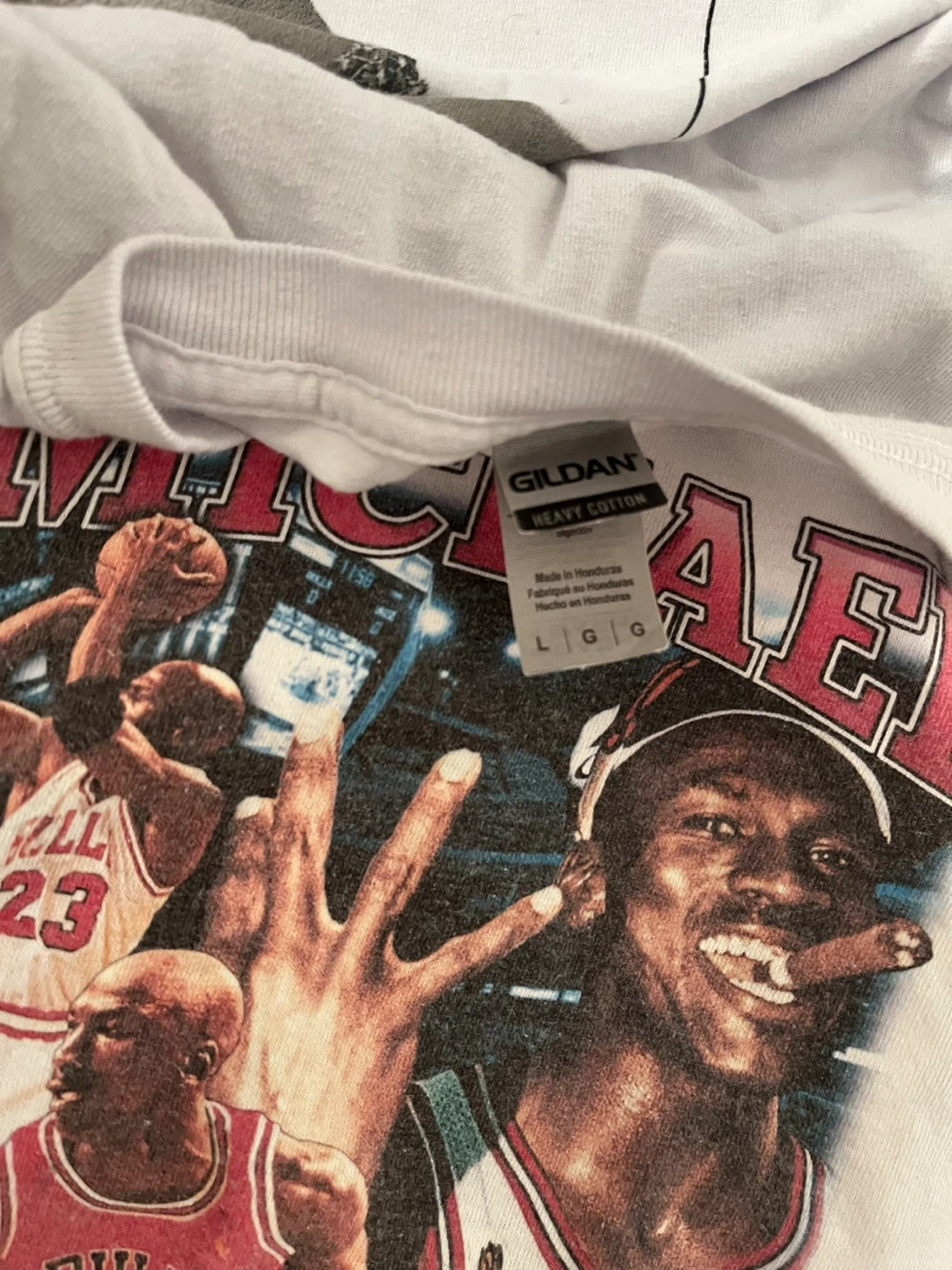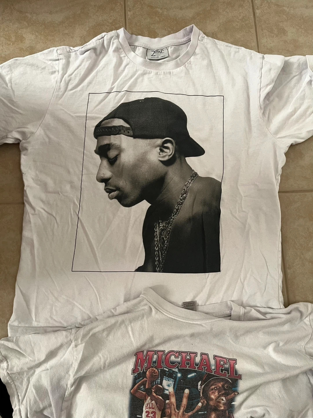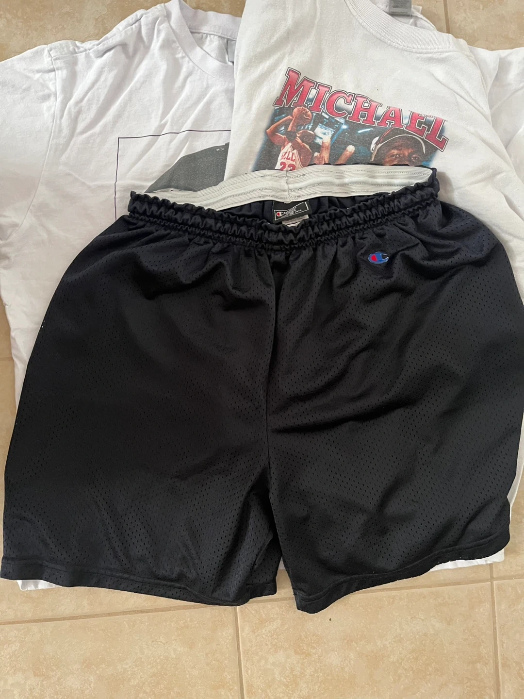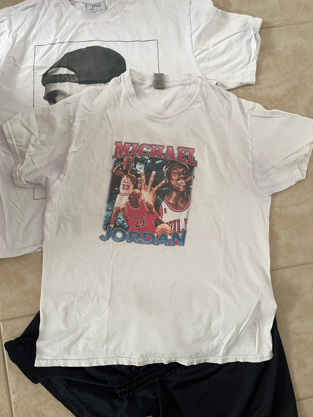 Selling a bundle of clothes for $25 Includes: Men’s size Large - 2Pac T-shirt (Size L) - Michael Jordan T-shirt (Size L, Gildan Heavy Cotton) - Champion Black Shorts (Size L) All in good condition.