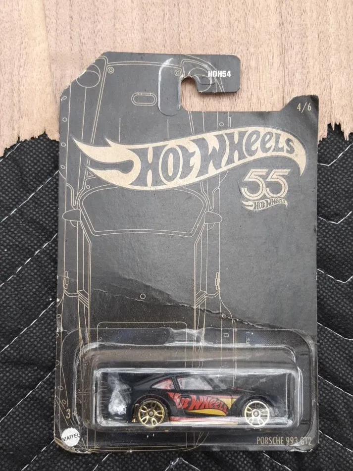 This is a Hot Wheels 55th Anniversary edition featuring a Porsche 993 GT2. It's a 1:64 scale die-cast car in black with gold wheels. Comes in its original packaging.