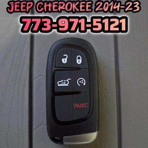 Smart Remote Key Fob for Jeep Cherokee. $130 synced to your vehicle or $30 for the key fob ONLY. This part is designed for the 2014-2023 Jeep Cherokee models equipped with a pushbutton start and remote proximity keyless entry system. The fob includes buttons for lock, unlock, panic, remote engine start, and power door release (tailgate). It has an FCC ID of GQ4-54T, operates at a frequency of 433 MHz, and uses a CR2032 battery. An uncut emergency insert key is also included.