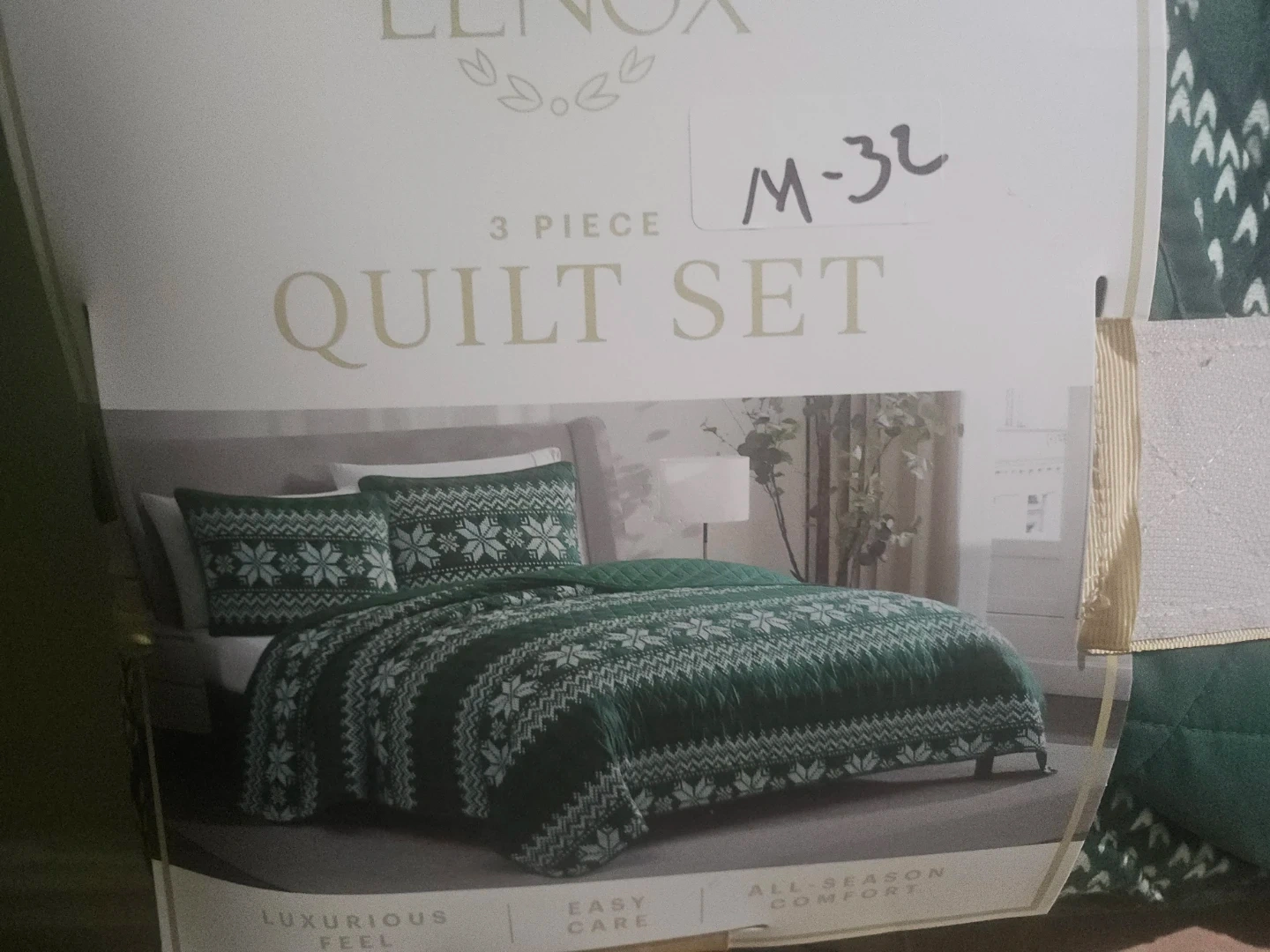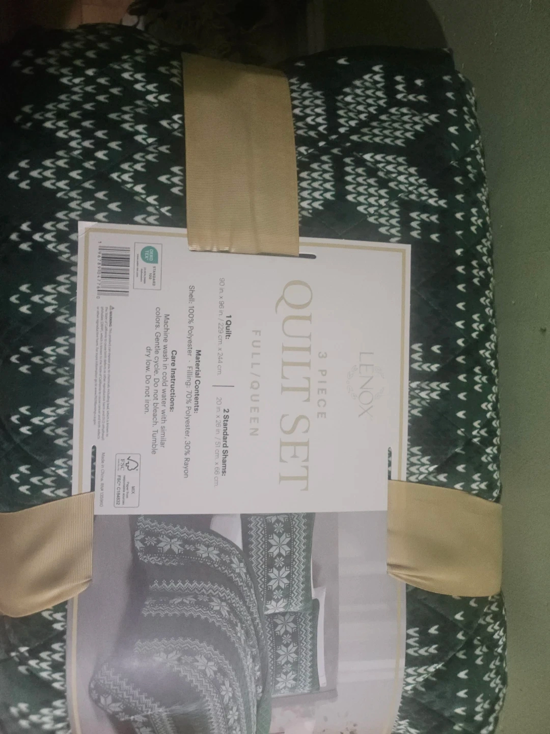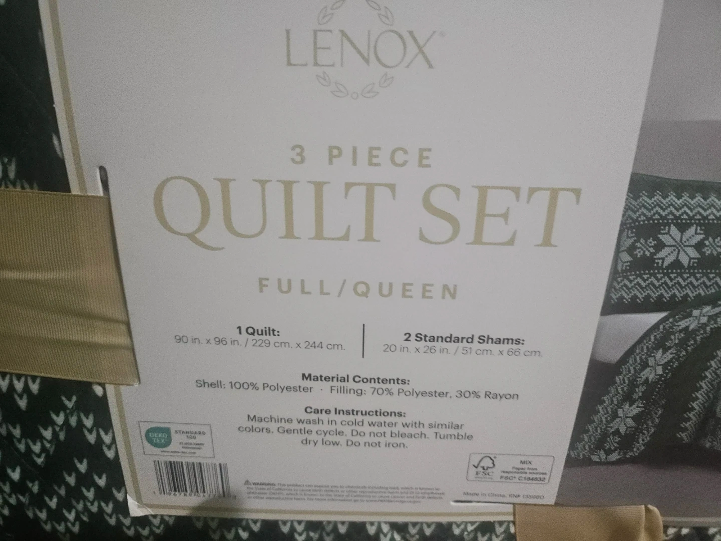 This is a Lenox 3-piece quilt set in Full/Queen size. It includes 1 quilt measuring 90 in. x 96 in. and 2 standard shams measuring 20 in. x 26 in. The shell is 100% polyester, with filling made of 70% polyester and 30% rayon. This set offers all-season comfort!