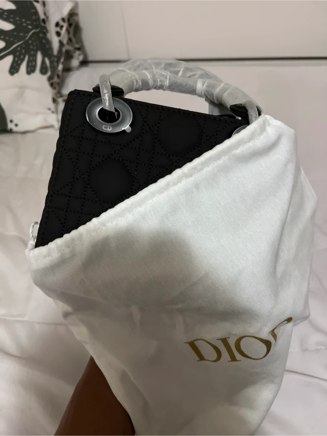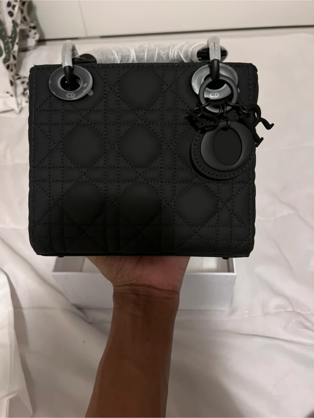 Black quilted leather Lady Dior handbag. Includes original dust bag and box. This iconic bag is a timeless accessory.