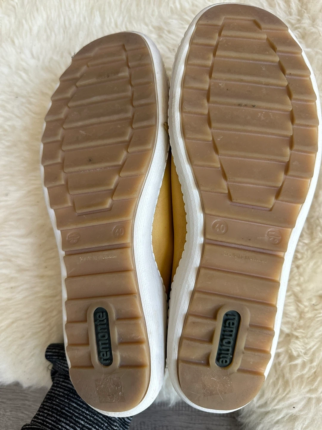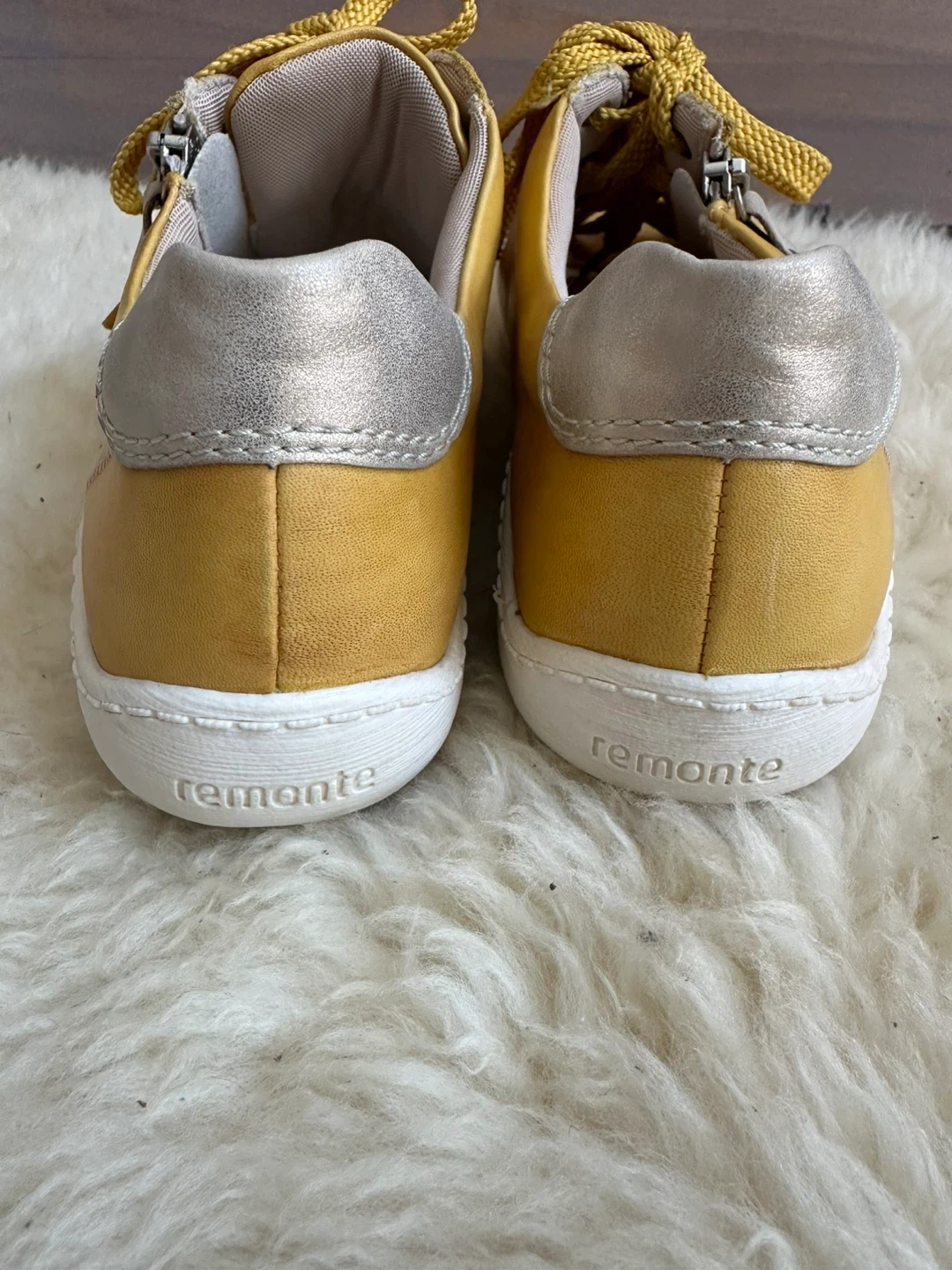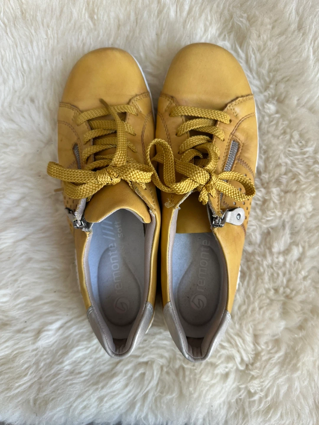 Remonte soft leather sneakers in a bright yellow colour. Features a side zipper and lace-up closure. Size is 40. These are great for everyday wear!