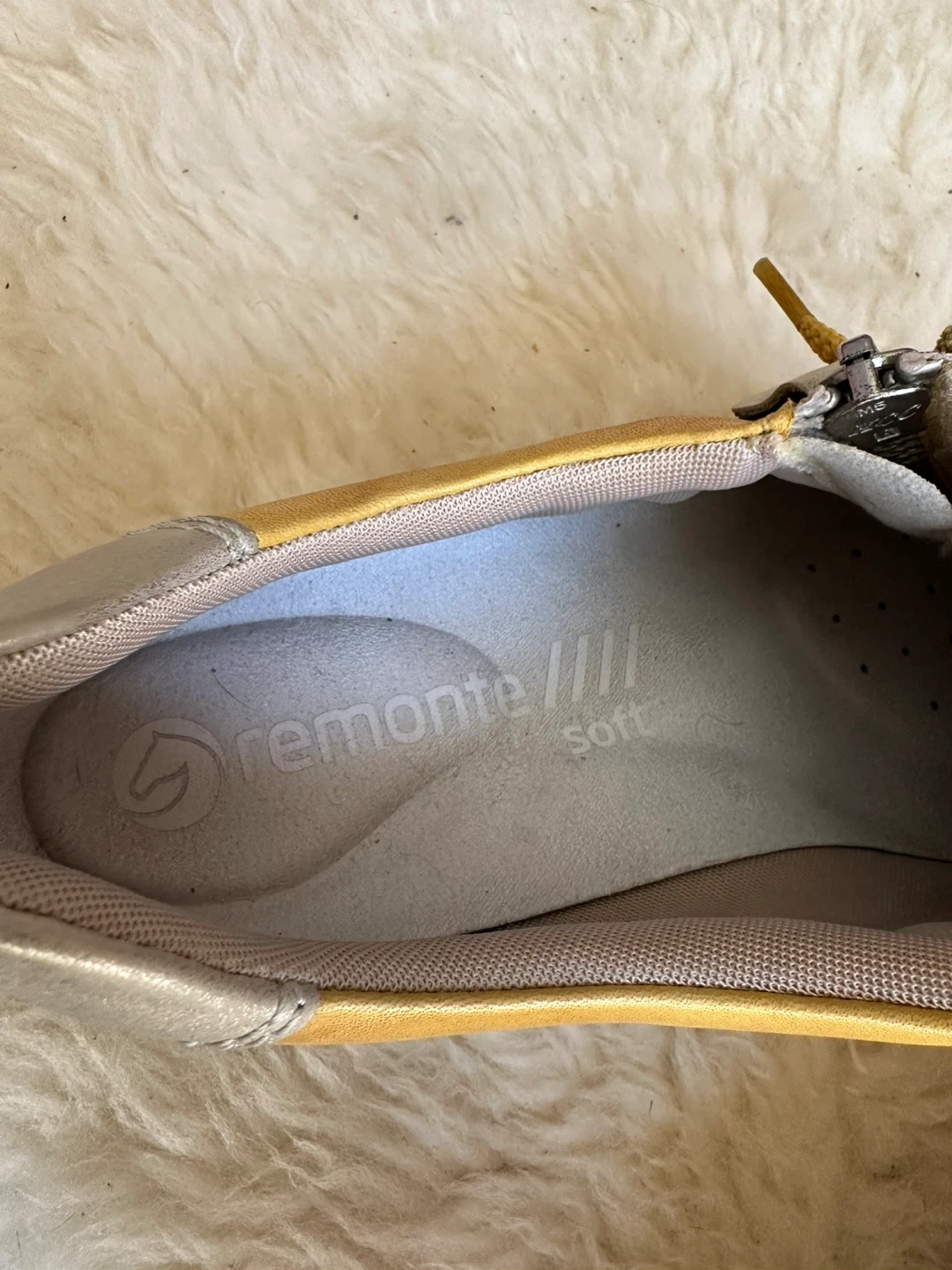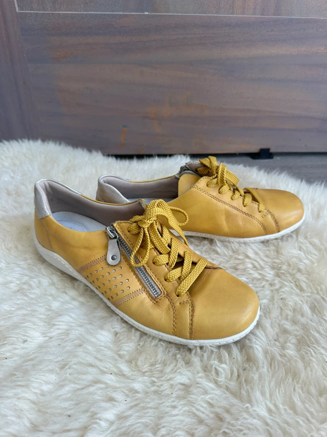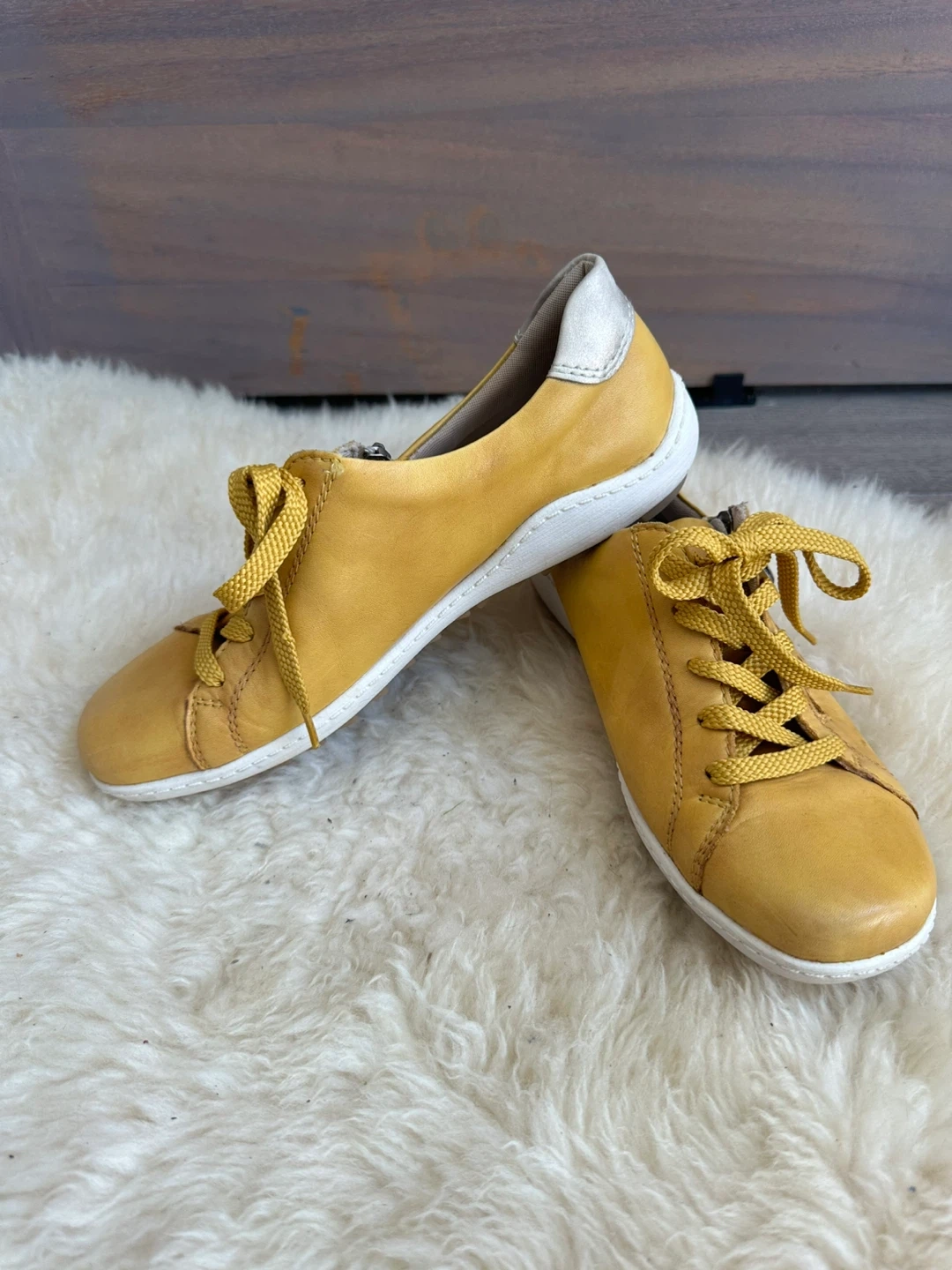 Remonte soft leather sneakers in a bright yellow colour. Features a side zipper and lace-up closure. Size is 40. These are great for everyday wear!