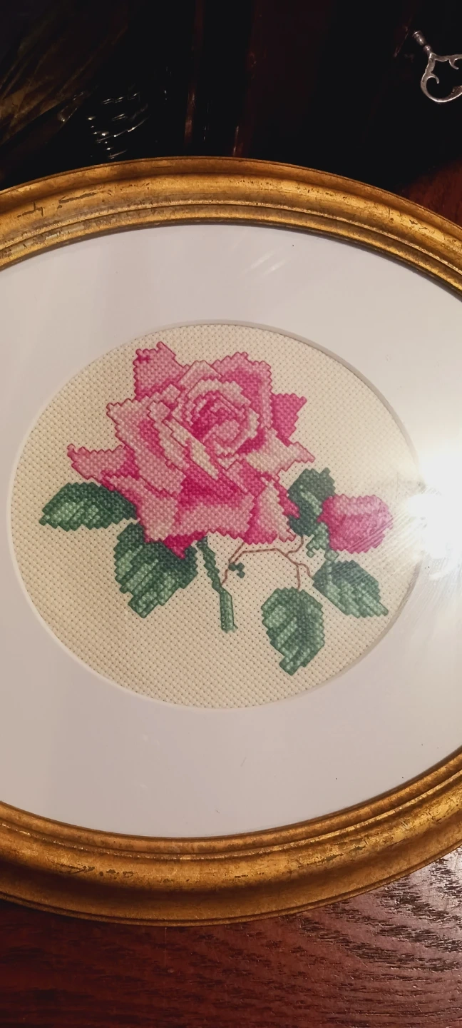Gold Tone Oval Framed Pink Rose Cross Stitch Art