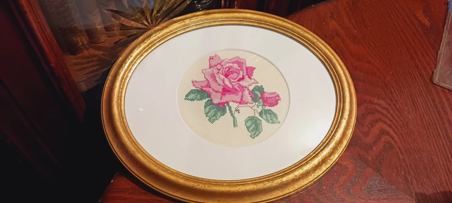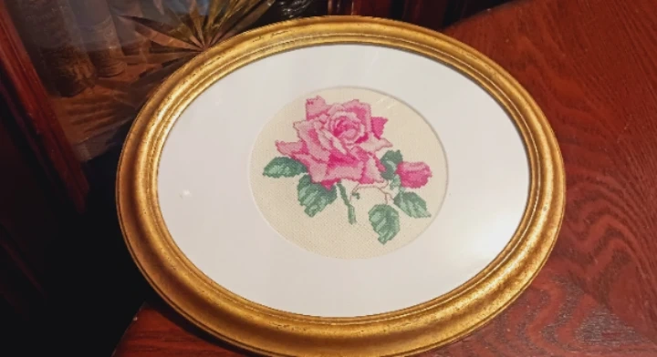 Gold Tone Oval Framed Pink Rose Cross Stitch Art