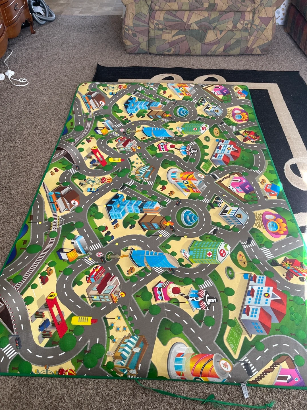 This is a large play mat featuring a detailed city scene with roads, buildings, and various attractions. It's made of durable material and perfect for toy cars and imaginative play. It provides a fun surface for kids to explore and create their own adventures!