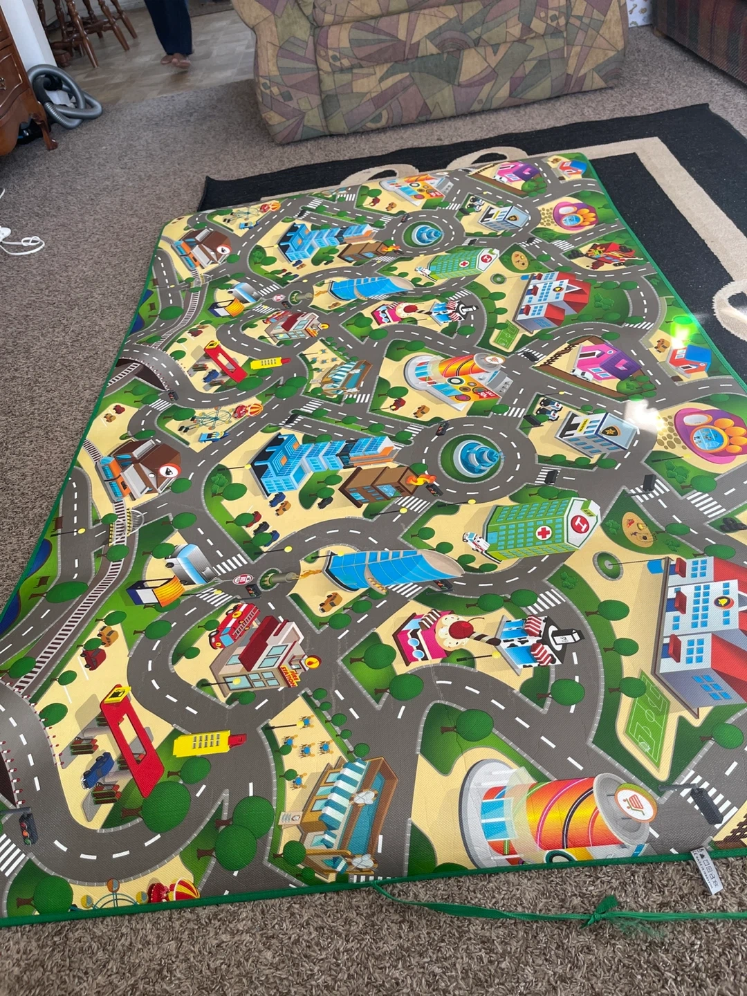 This is a large play mat featuring a detailed city scene with roads, buildings, and various attractions. It's made of durable material and perfect for toy cars and imaginative play. It provides a fun surface for kids to explore and create their own adventures!