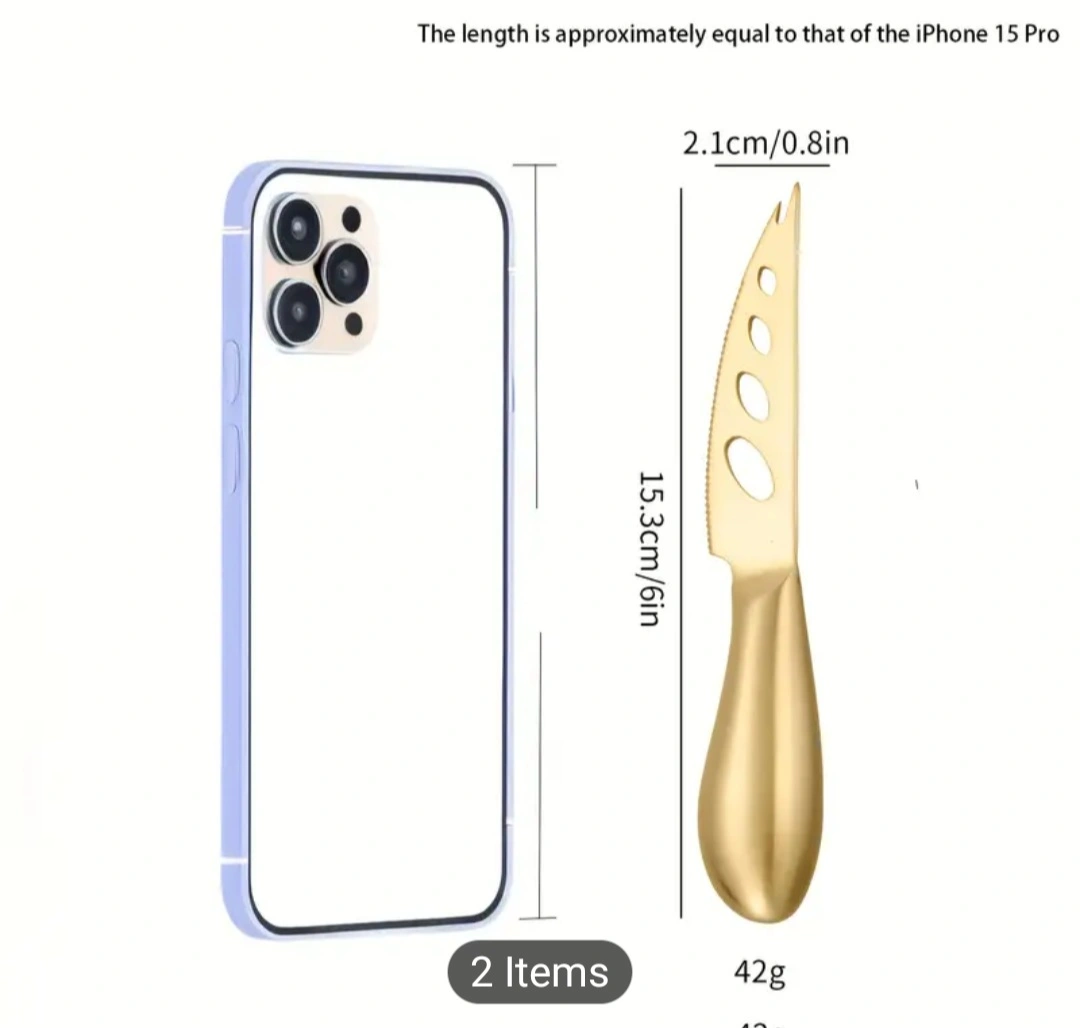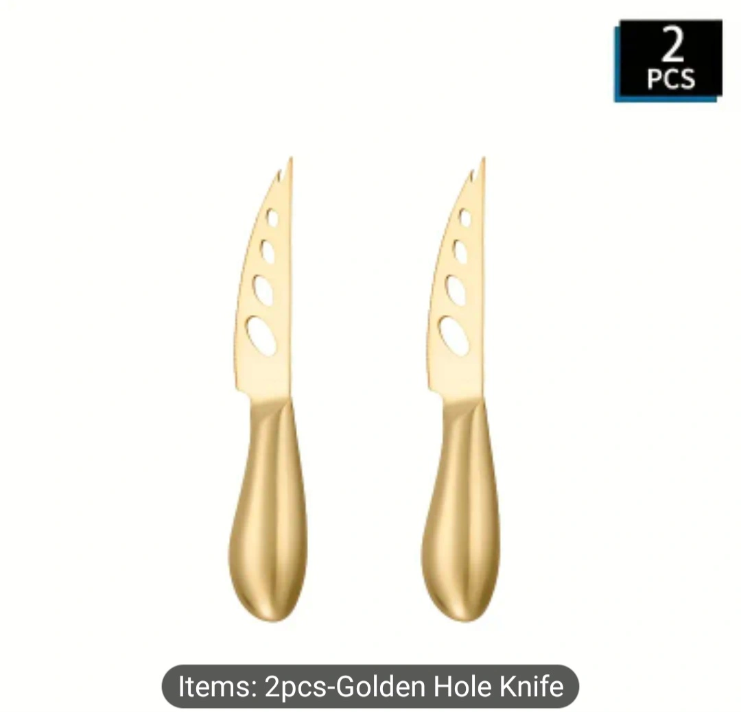 60This is a brand new set of two golden cheese knives. They have a unique hole design on the blade so the cheese doesn't stick to the knife while cutting it. The knives are approximately 15.3cm/6in long and weigh 42g each. Has a nice weight to it.