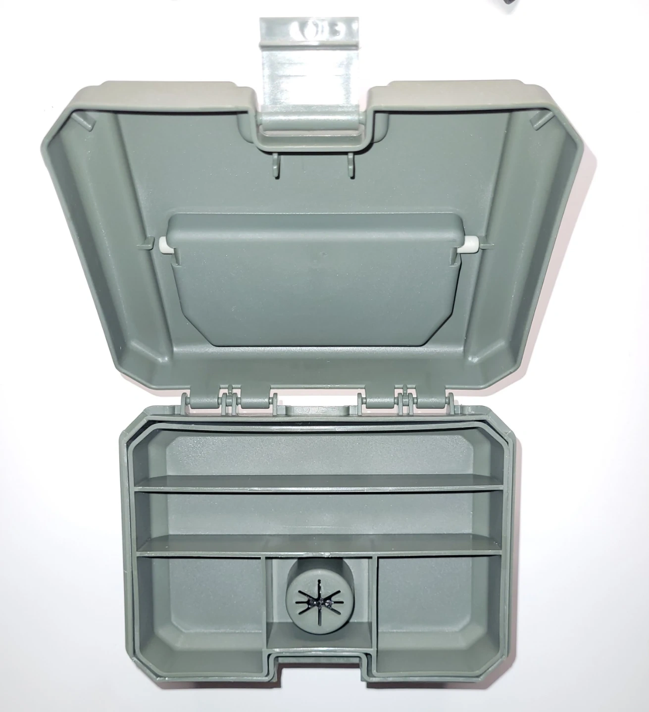 Removable tray with compartmentalized storage stores nocks, fletchings, field points, and wax. Lift it out to access your broadheads.