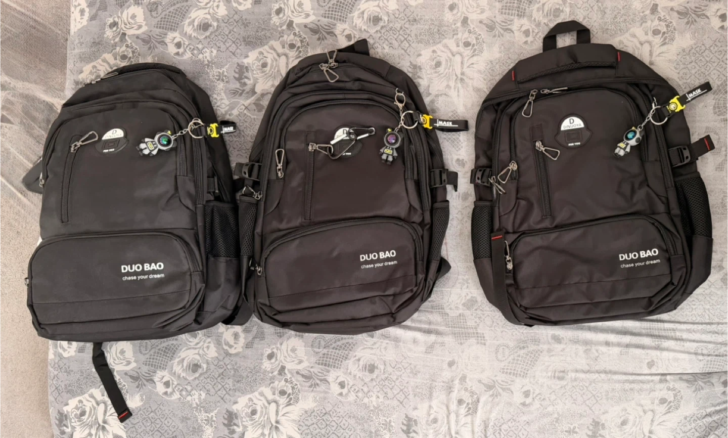 This black DUO BAO backpack offers multi-function large capacity storage space. It features a large main bag, multi-functional, top zipper pocket, zip-front pouch, lower front zipper pocket, and a water cup side pocket. It's made of durable material and includes a keychain accessory. Only 5 left in stock, hurry up!