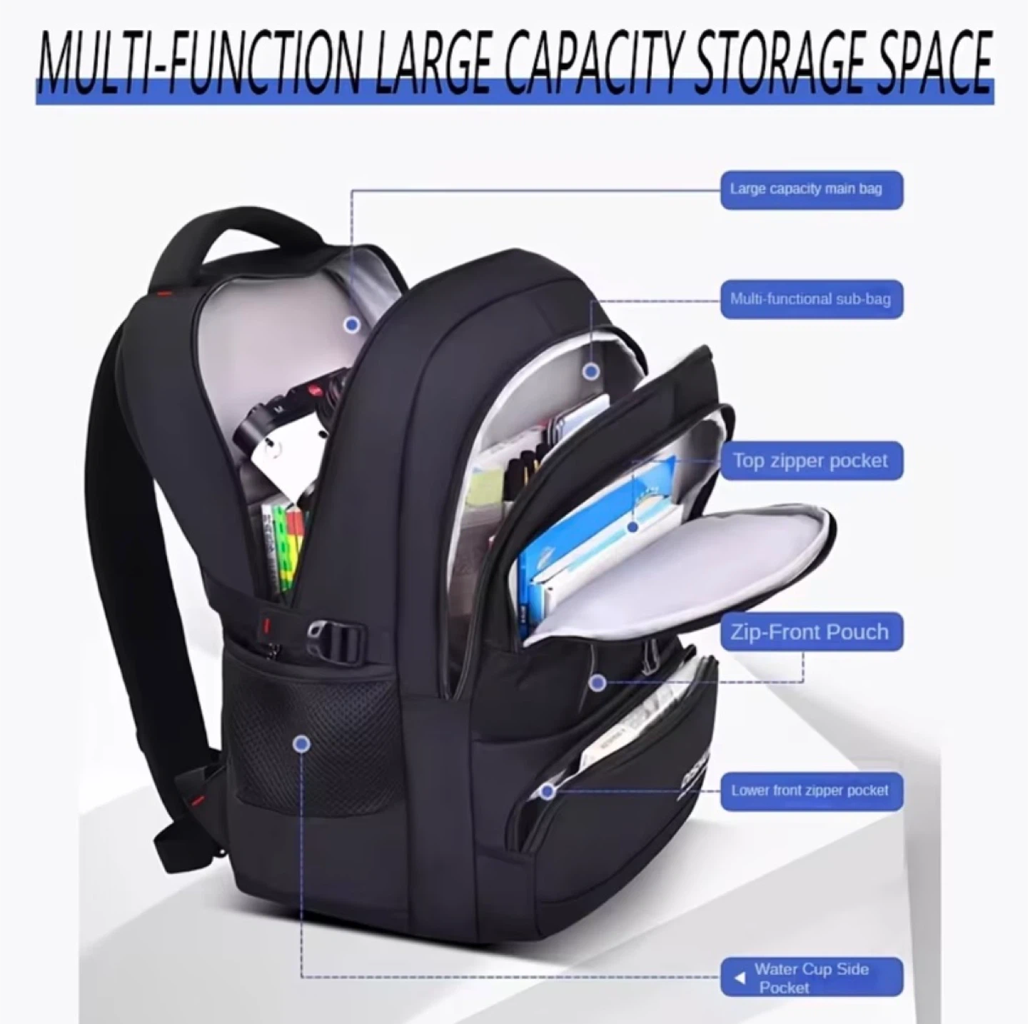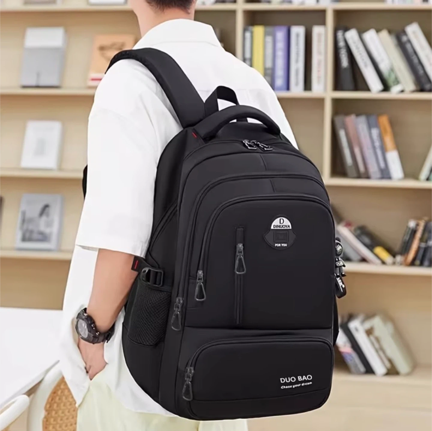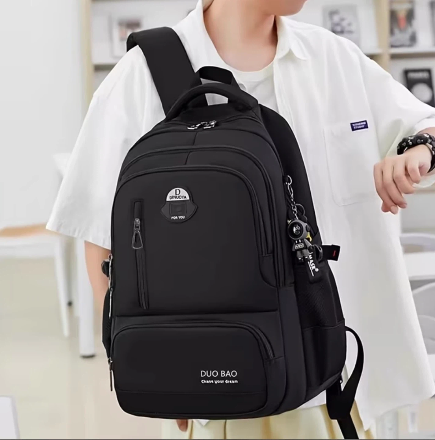 This black DUO BAO backpack offers multi-function large capacity storage space. It features a large main bag, multi-functional, top zipper pocket, zip-front pouch, lower front zipper pocket, and a water cup side pocket. It's made of durable material and includes a keychain accessory. Only 5 left in stock, hurry up!