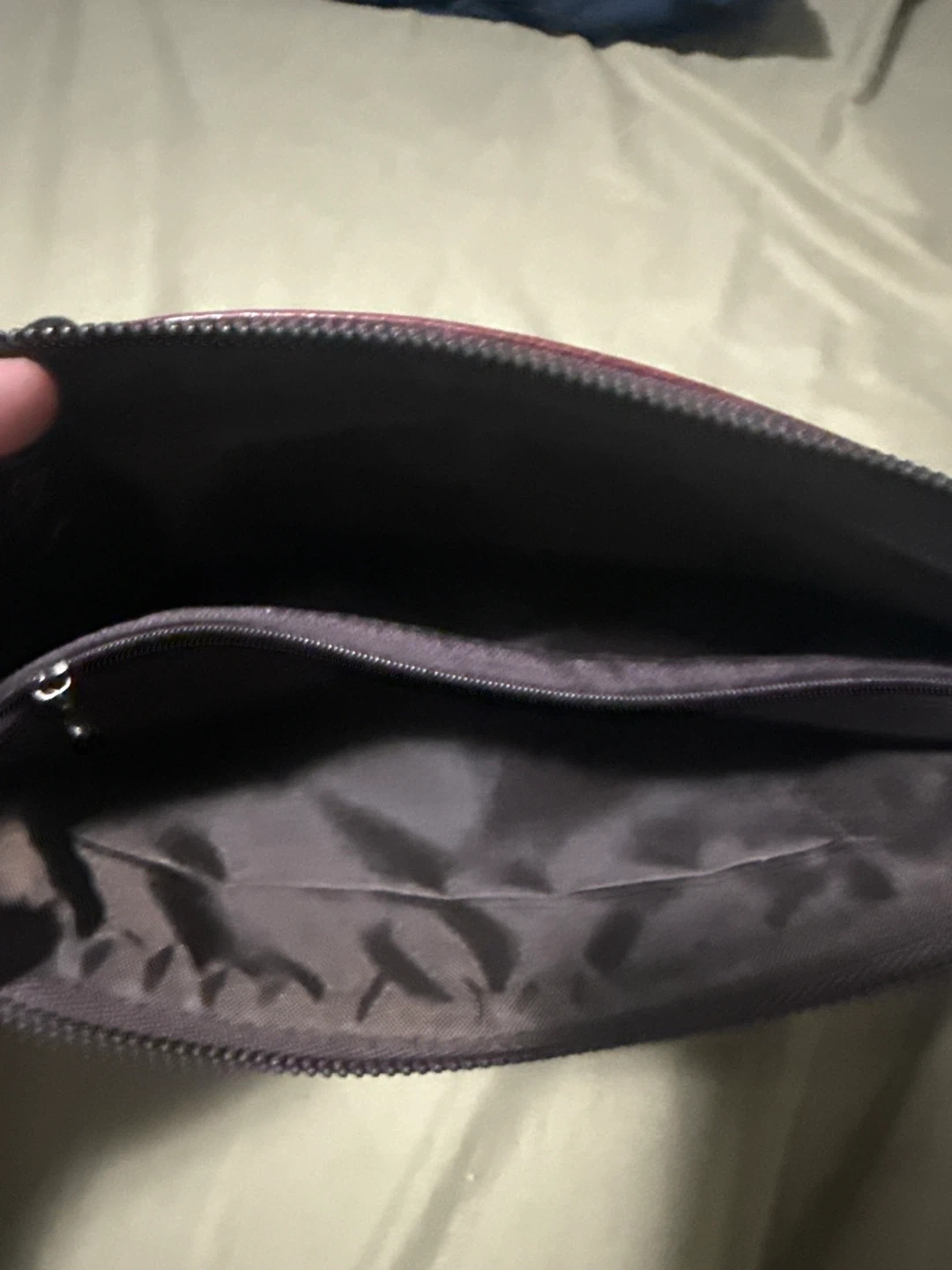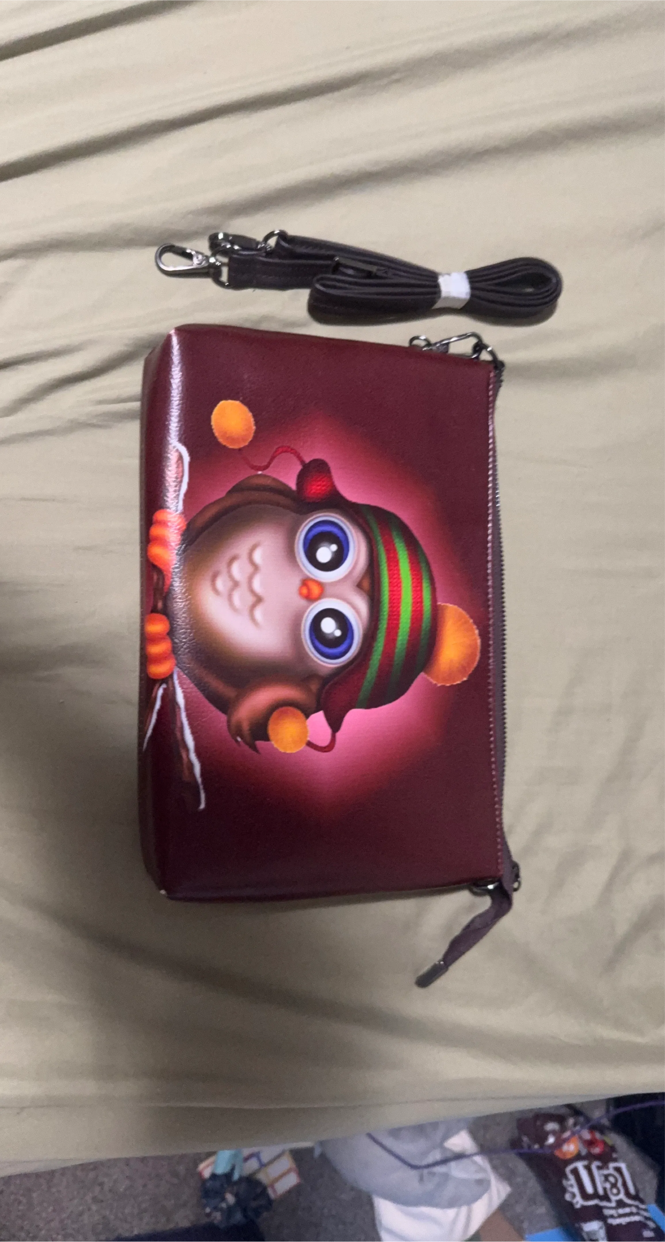 This red clutch purse features a cute owl design with a detachable strap. It has a zippered main compartment and an interior zippered pocket for organization.