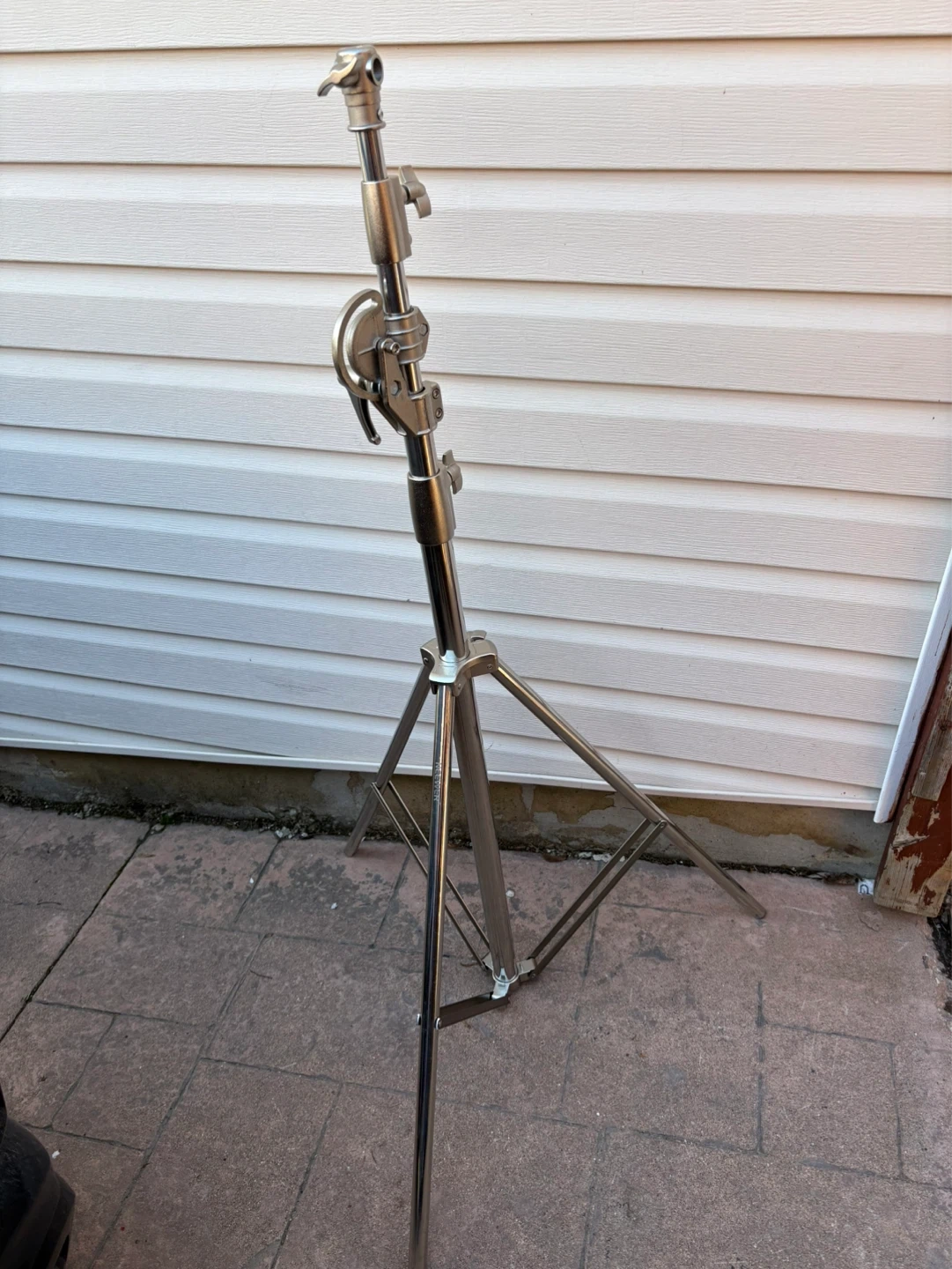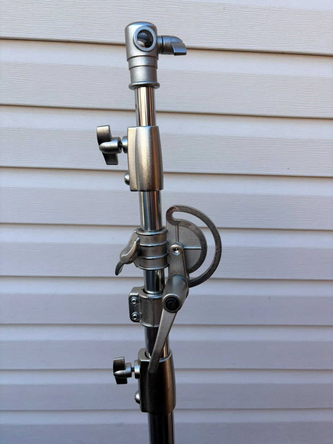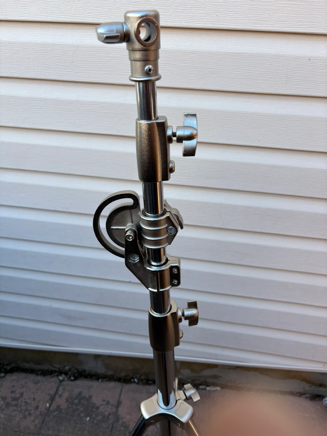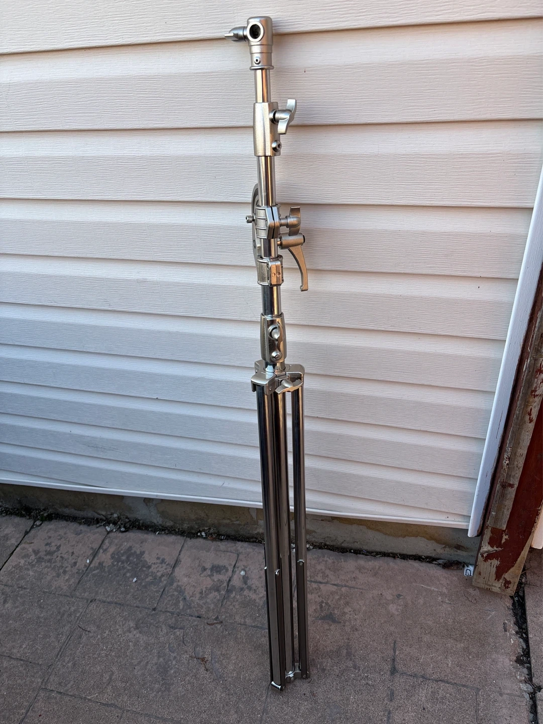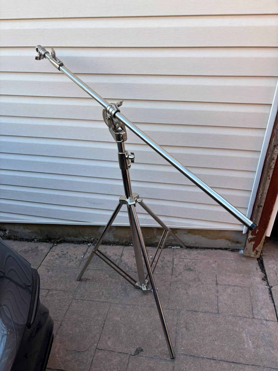 This chrome boom arm stand features a sturdy tripod base and adjustable arm. It's made of metal and includes multiple locking mechanisms for secure positioning. Useful for lighting or camera setups!
