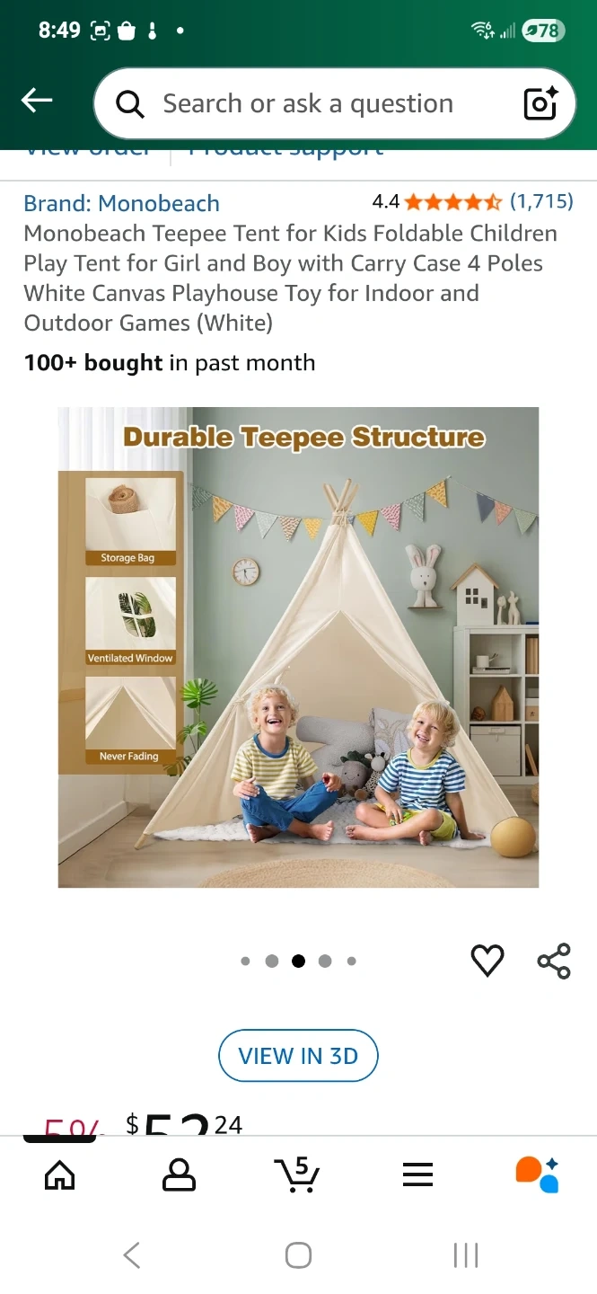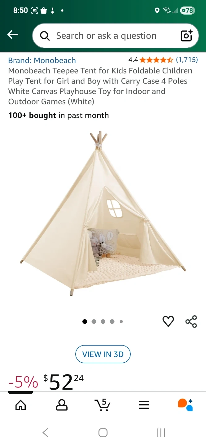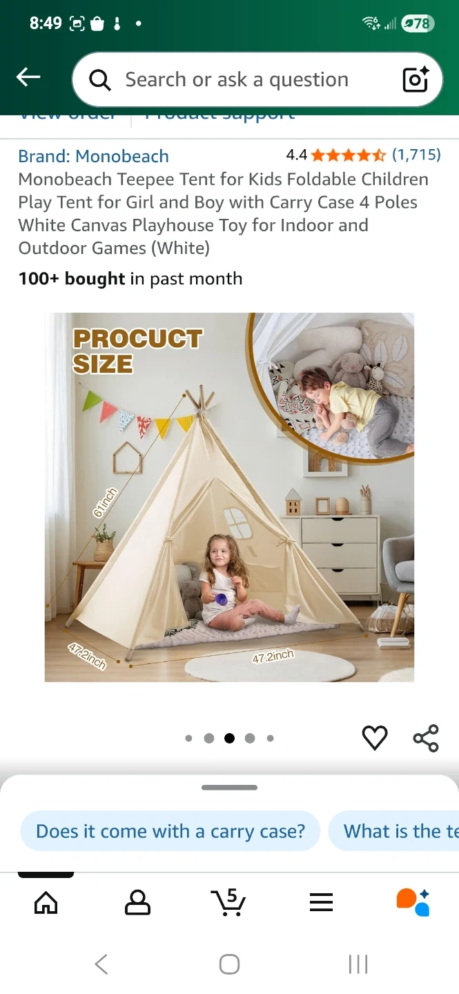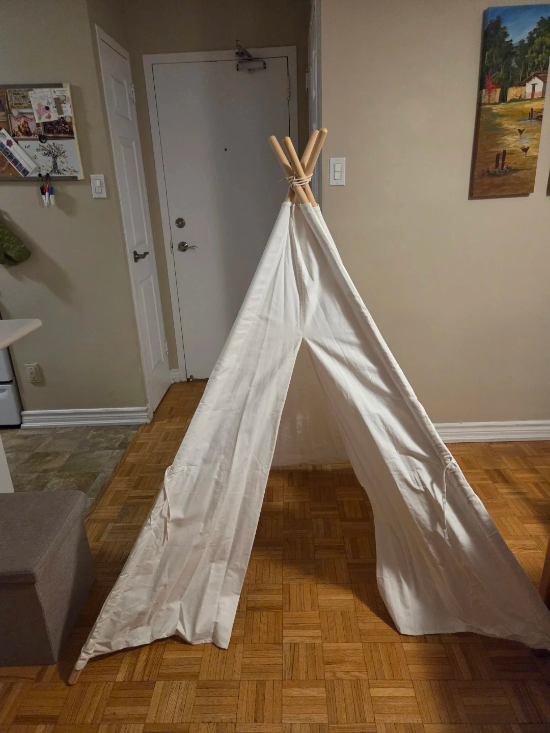 Selling my daughter's (barely used) off white canvas teepee tent. Was purchased as a gift then put in storage due to a move which didnt have space for it. She has now outgrown it, so I am looking to declutter my stoarage space. Includes 4 poles for easy setup and take down, was used indoors only but perfect for indoor and outdoor play. The dimensions are 47.2 inches by 47.2 inches with a height of 61 inches. Asking $35