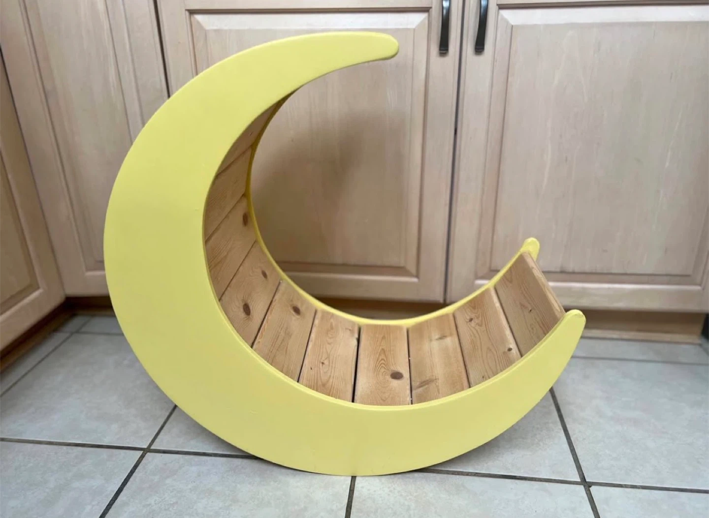 This prop is a beautiful yellow crescent moon, perfect for newborn photography sessions. It's made with a wooden interior and a smooth yellow exterior. Great for creating adorable celestial-themed baby photos! Available for RENTAL pick up in North Babylon Long Island.